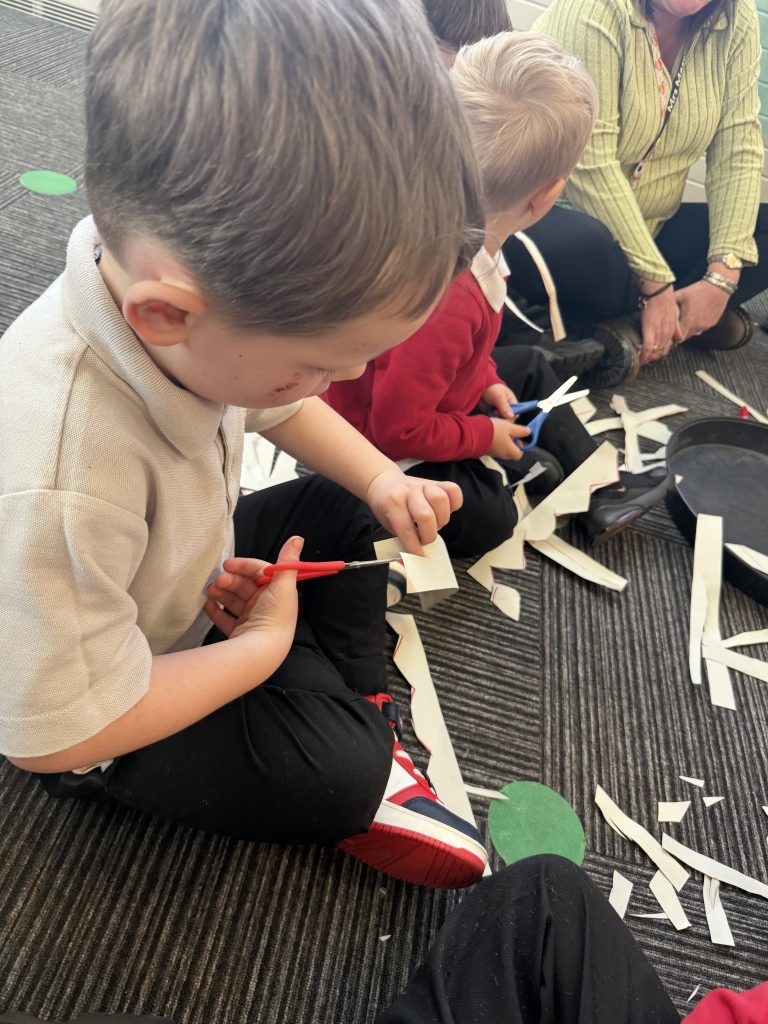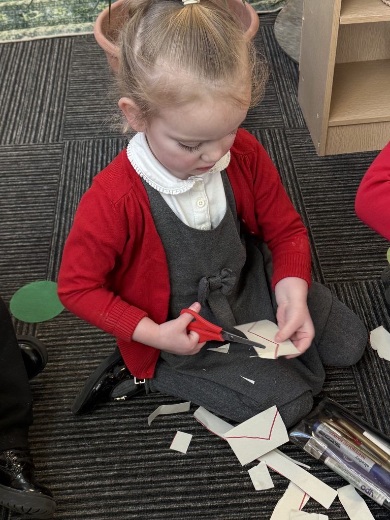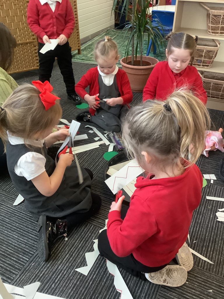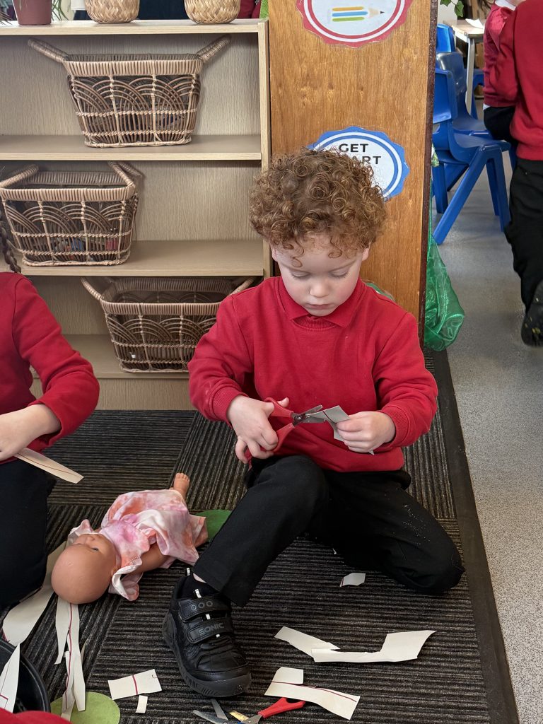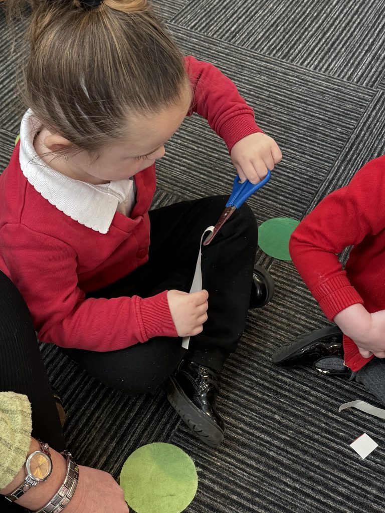 During this session, the children were given the challenge of following pre-made cutting lines. This activity encourages children to think critically and problem-solve as they work their way through the change in directions, how to hold the paper, and cut using one hand while stabilising the other.