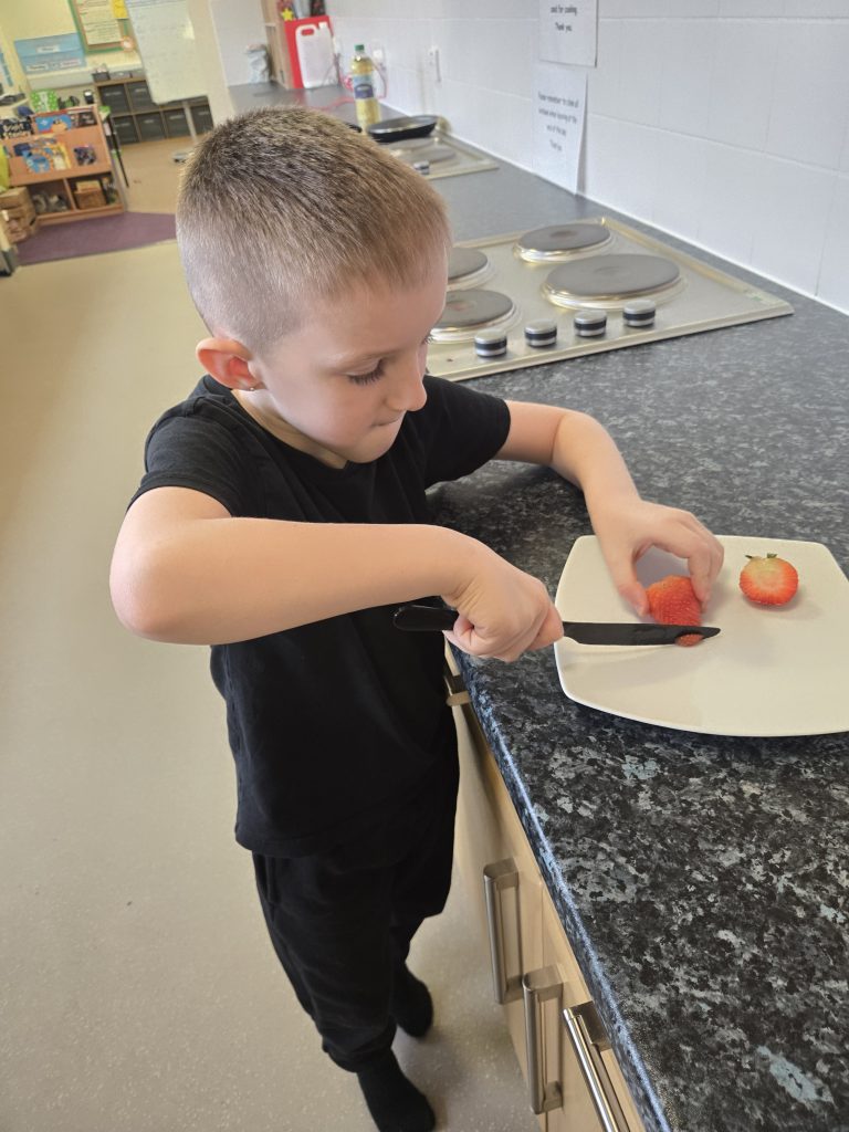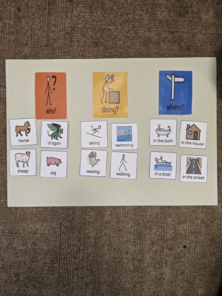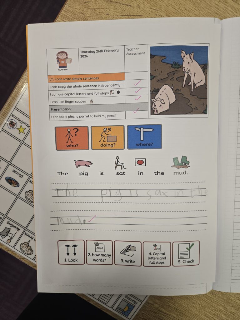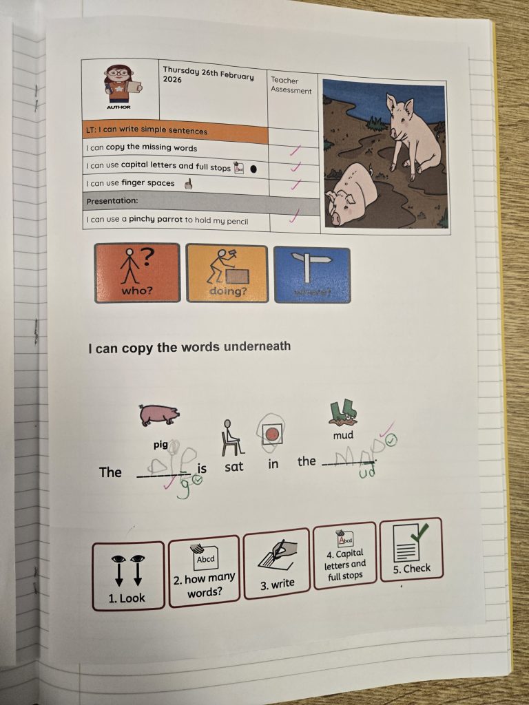 Today in writing they copied the sentence making sure they used a capital letter at the beginning of the sentence followed by a full stop at the end of the sentence. We made sure that we had finger spaces in between our words. In activate (do now ) we checked that we knew what who?, doing? and where? .We made sure by completing a task first before our writing.