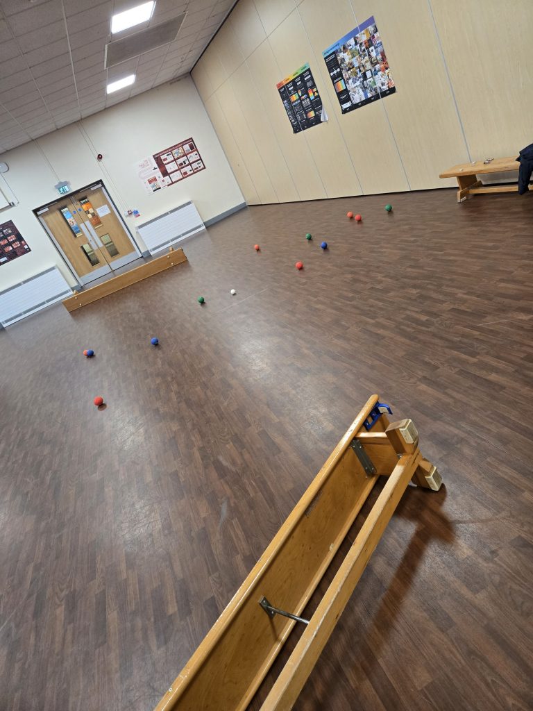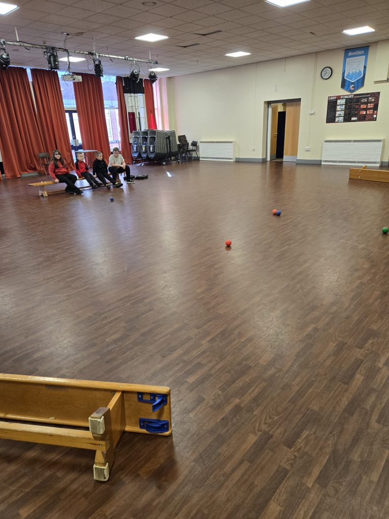 Today in pe the children played a game of boules where first they rolled the white ball and then they had 3 coloured balls each . The person who rolled their ball closest to the white ball wins.