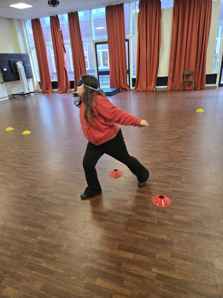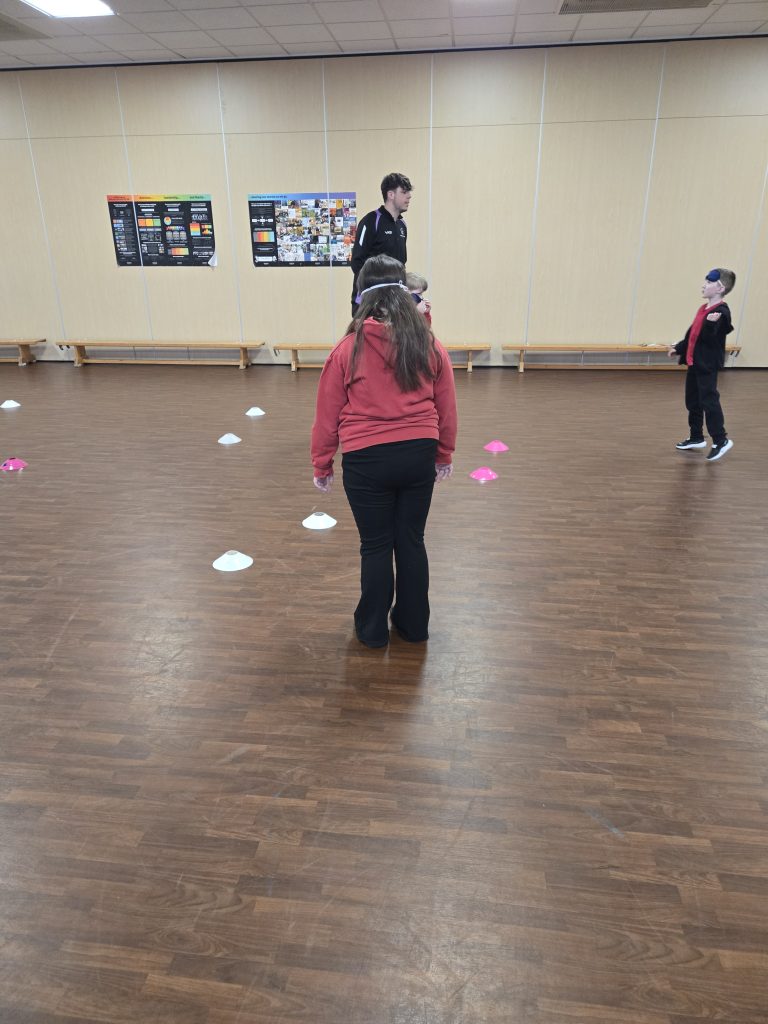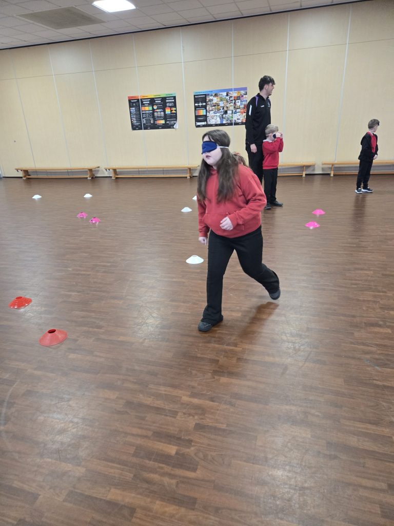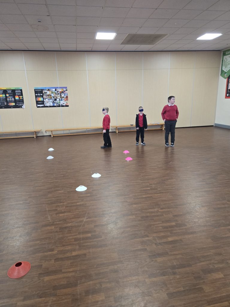 The children in pe blind folded each other and tried to get them round the maze and through the gates .