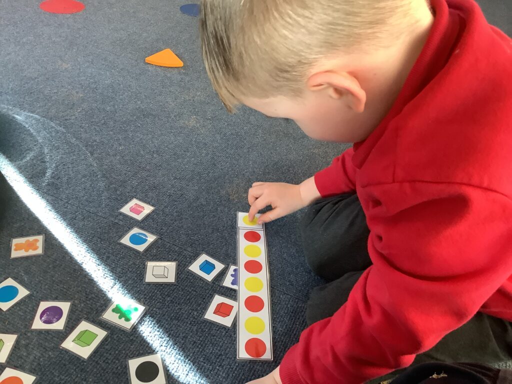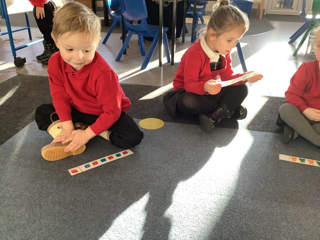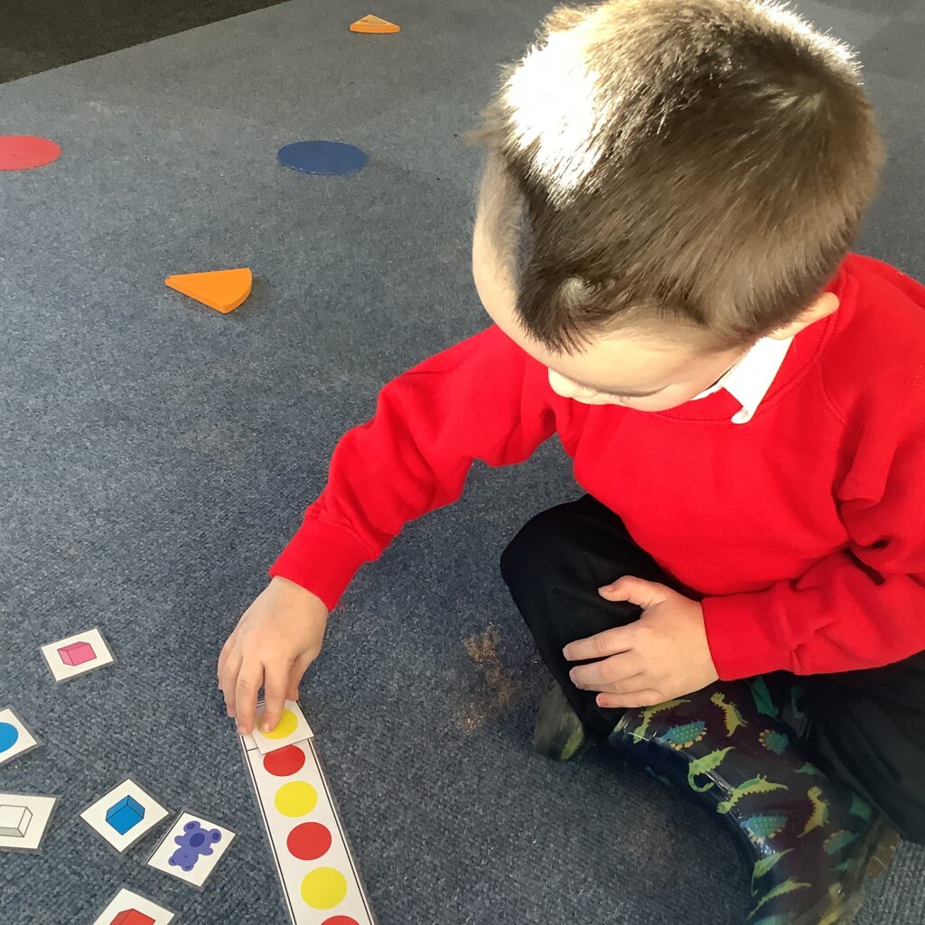 We have been looking at repeating patterns and what the word ‘repeating’ means. We talked about how it is the same thing again, and again, and again. We started by chanting each of the colours in the pattern, which helped us to continue the pattern – even without the pictures on the board to help us! We then had to work together to see if we could find out what colour would come next in the pattern.