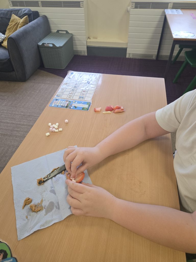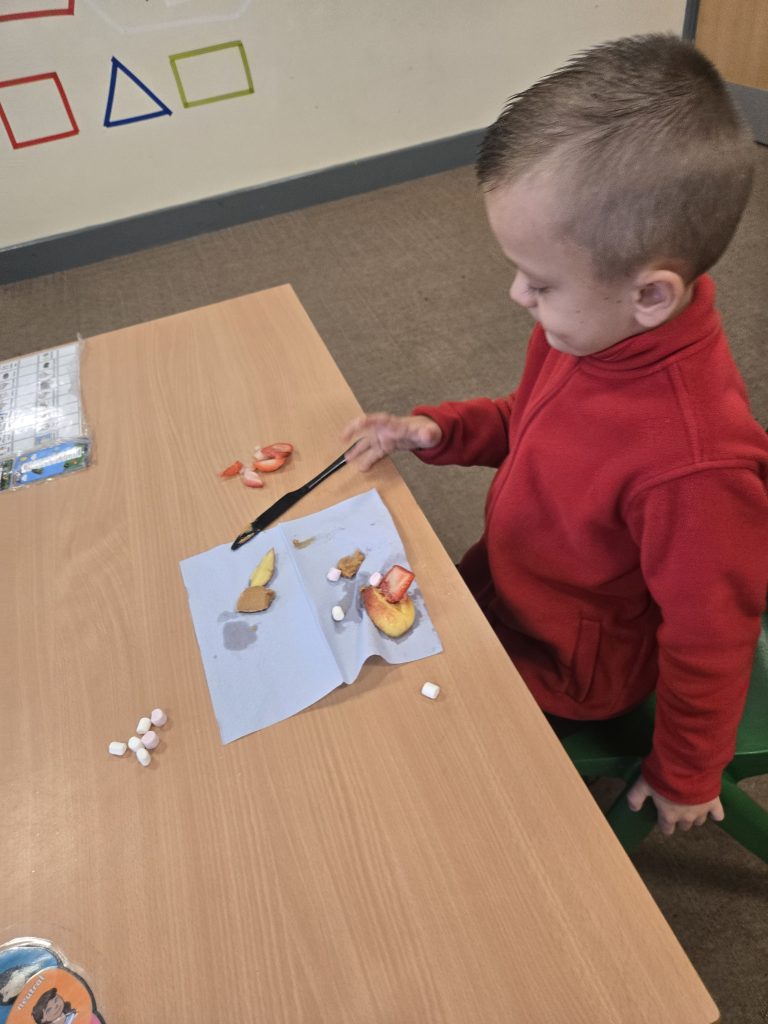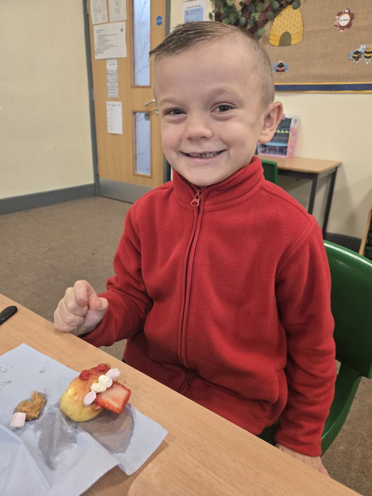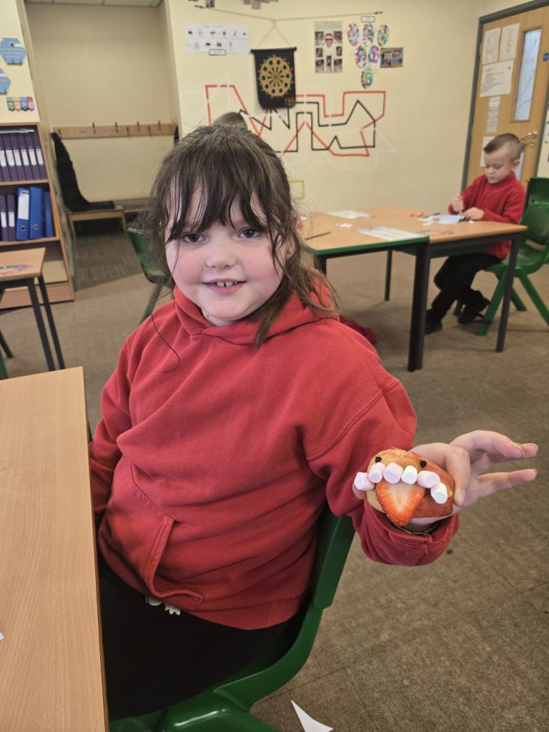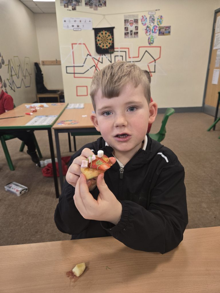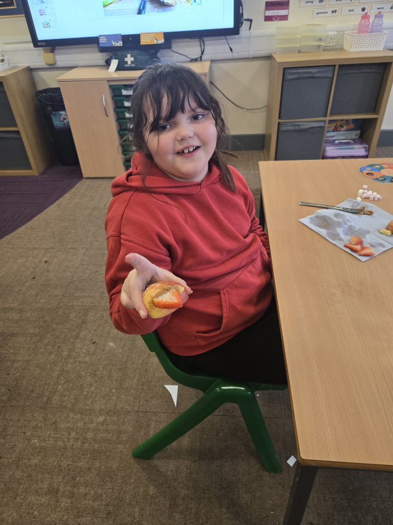 So today in life skills the children made apple monsters. They used apple’s for the head. Next they cut a mouth shape and added some peanut butter , strawberry for his tongue, mini marshmallows for the teeth . Finally the used some icing for its eyes.