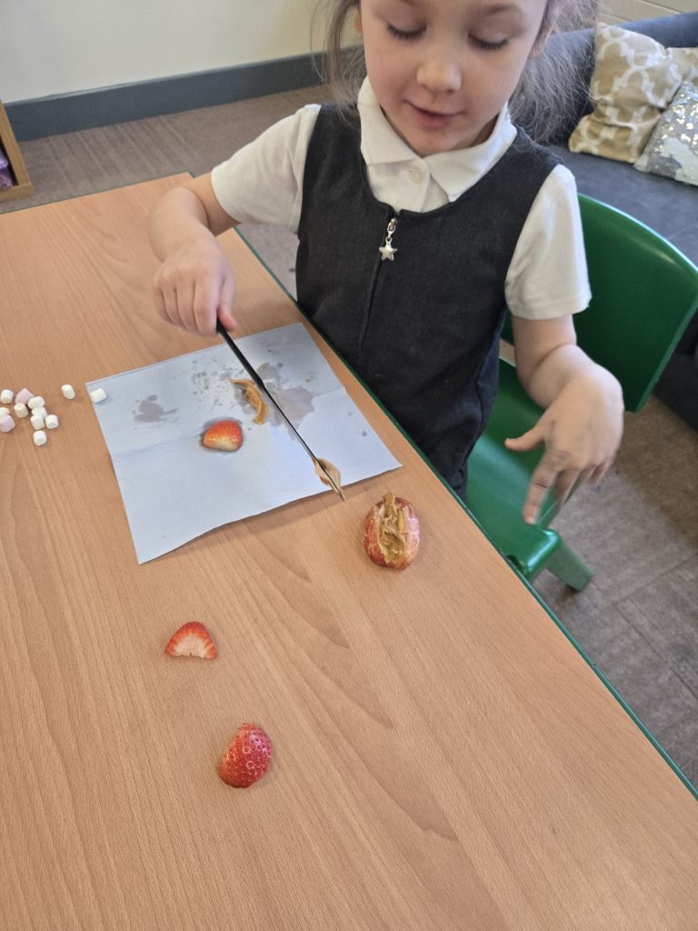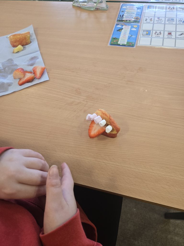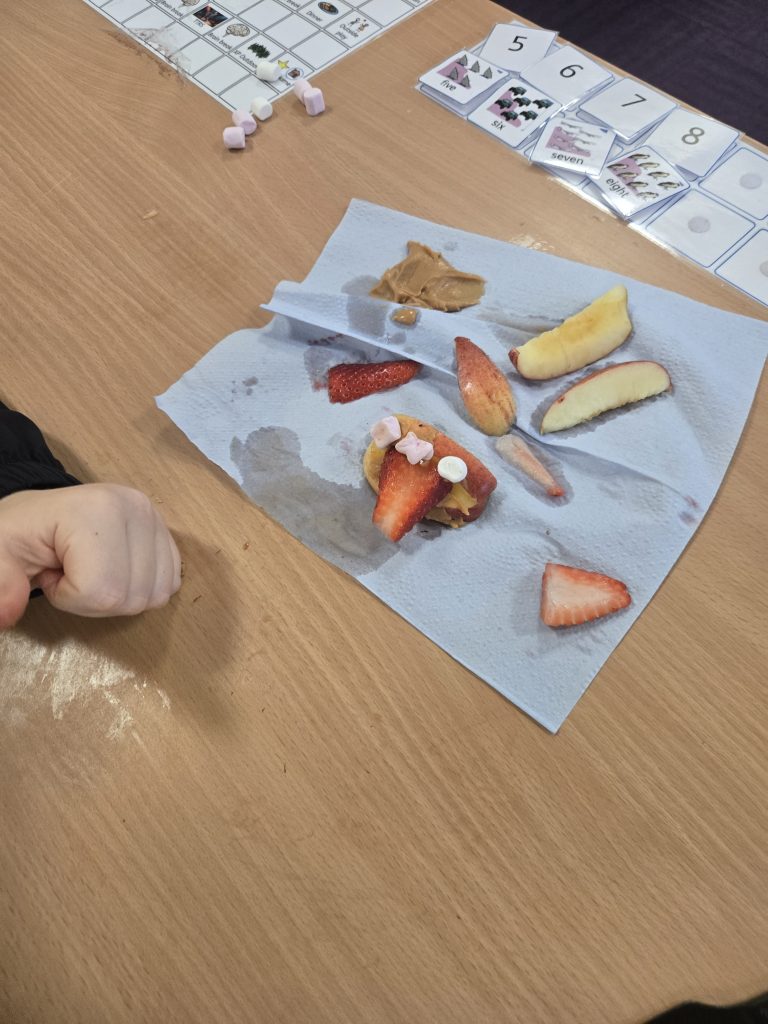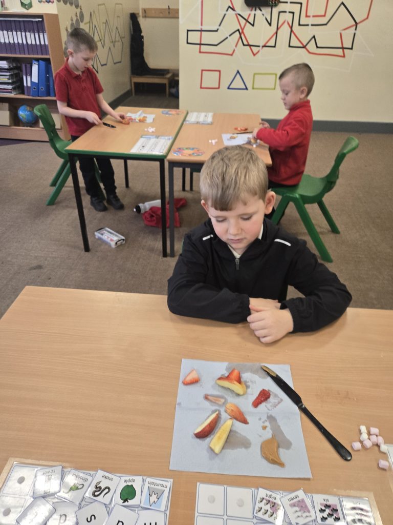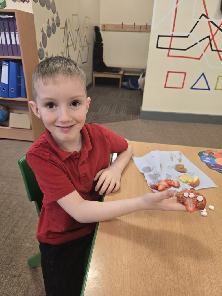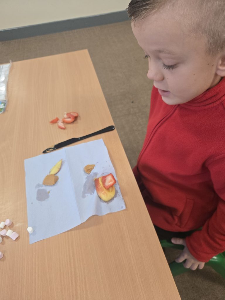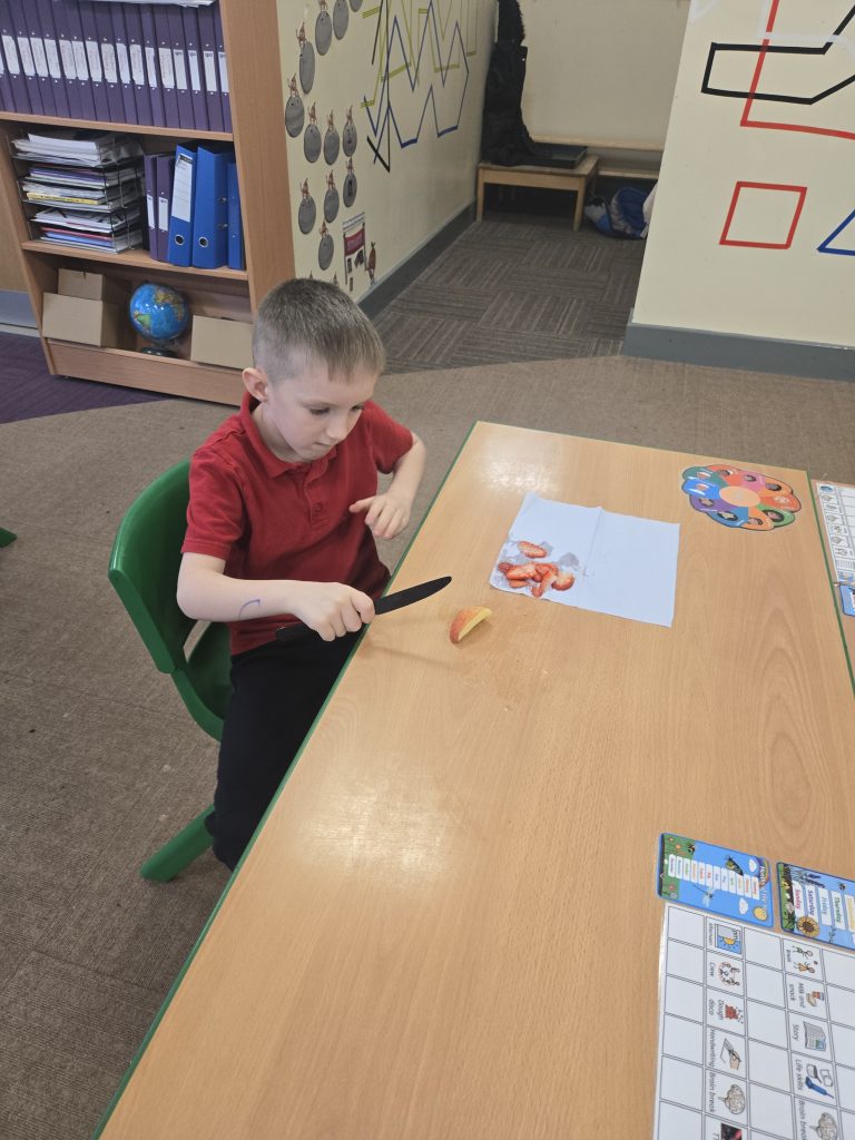 So today in life skills the children made apple monsters. They used apple’s for the head. Next they cut a mouth shape and added some peanut butter , strawberry for his tongue, mini marshmallows for the teeth . Finally the used some icing for its eyes.