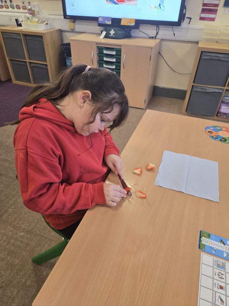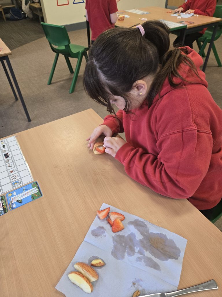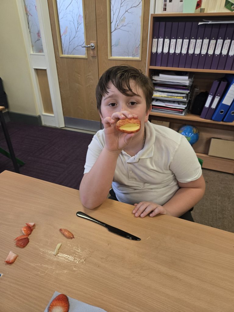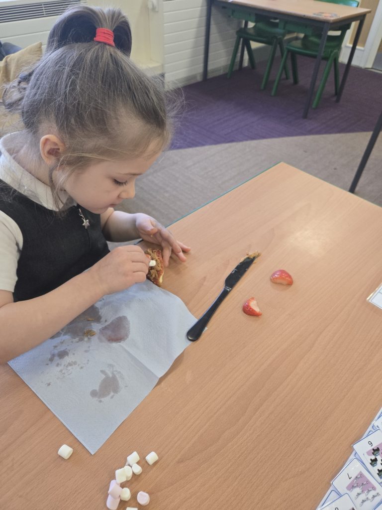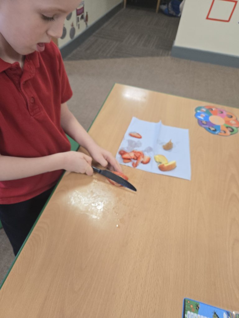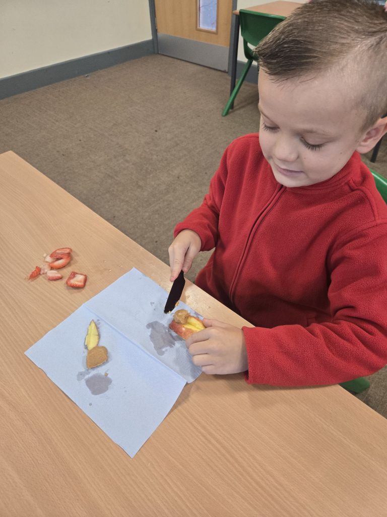 So today in life skills the children made apple monsters. They used apple’s for the head. Next they cut a mouth shape and added some peanut butter , strawberry for his tongue, mini marshmallows for the teeth . Finally the used some icing for its eyes.