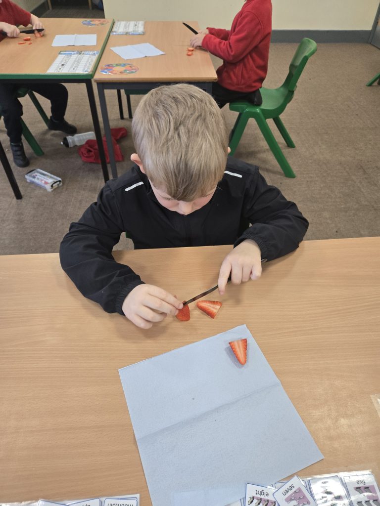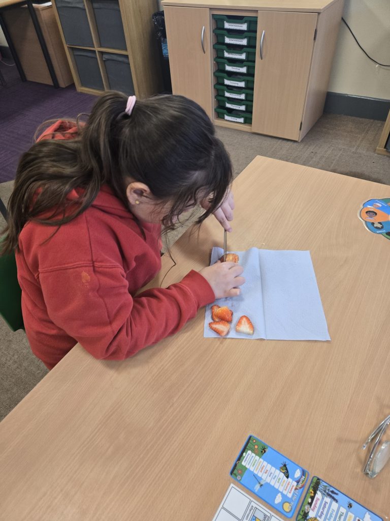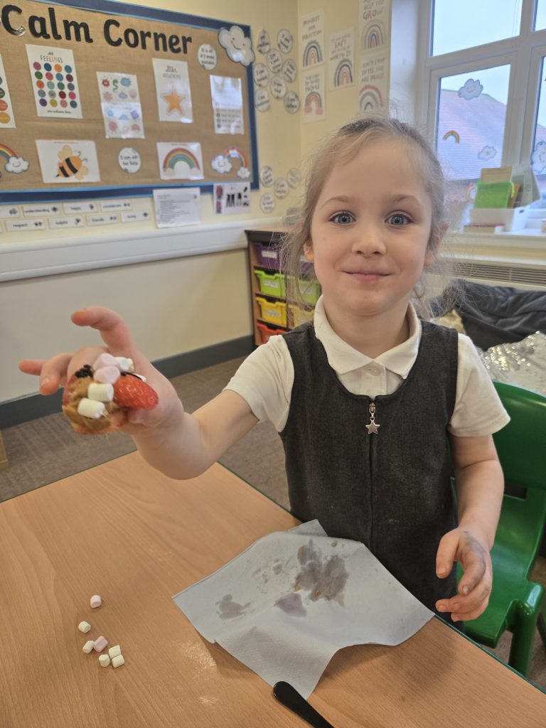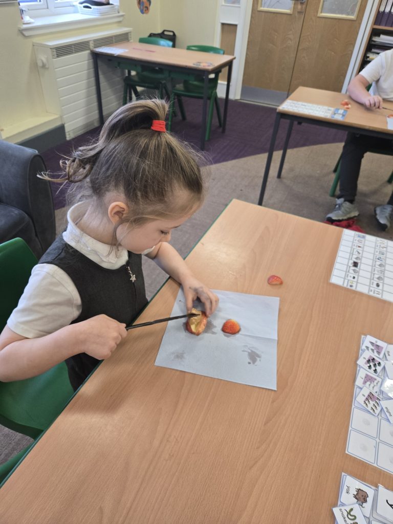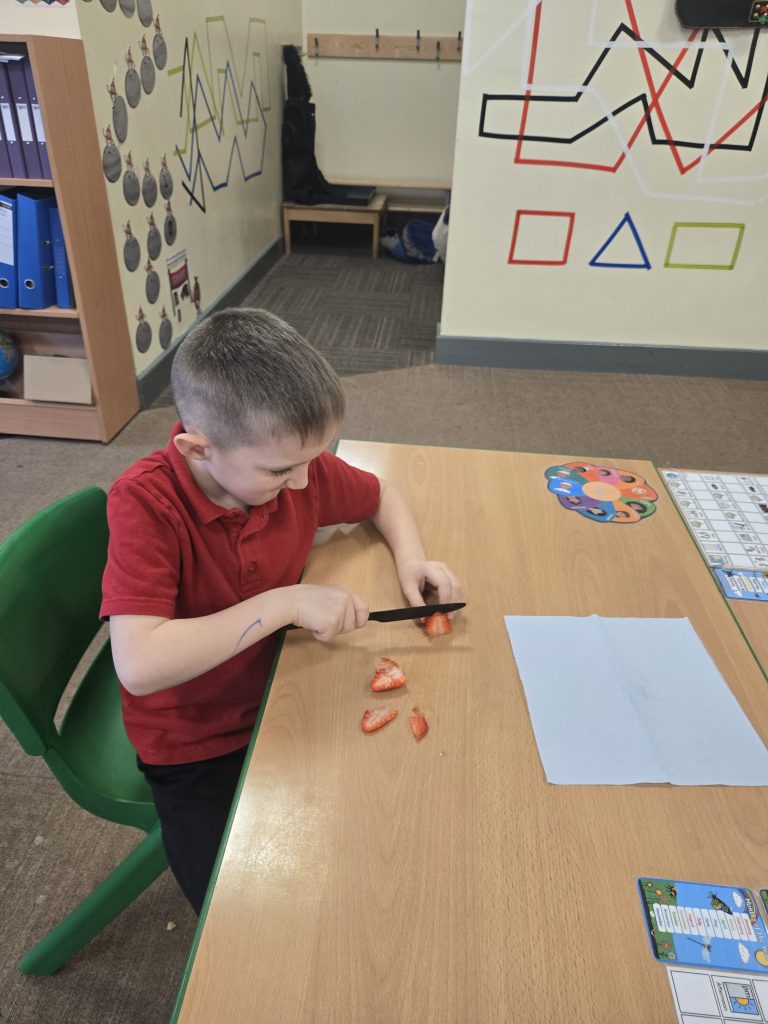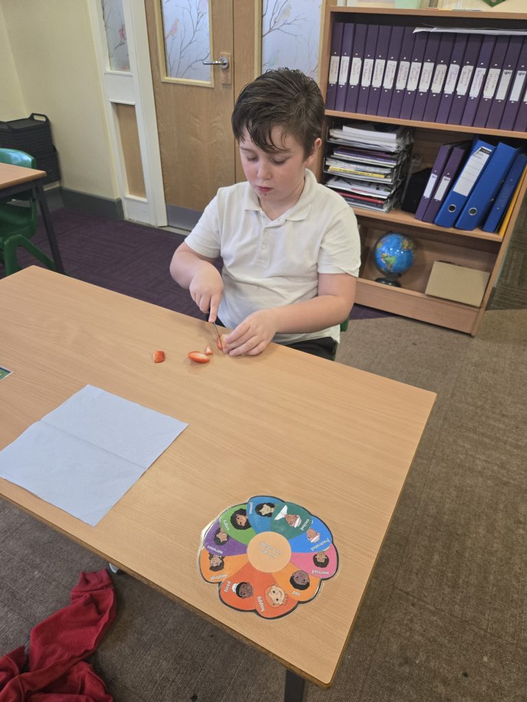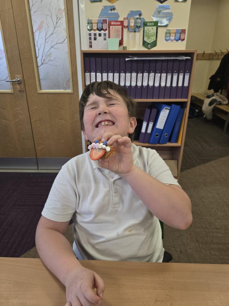 So today in life skills the children made apple monsters. They used apple’s for the head. Next they cut a mouth shape and added some peanut butter , strawberry for his tongue, mini marshmallows for the teeth . Finally the used some icing for its eyes.