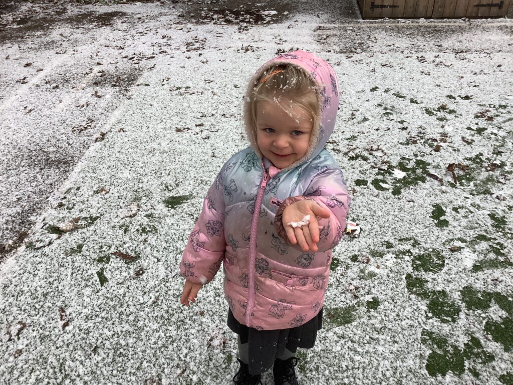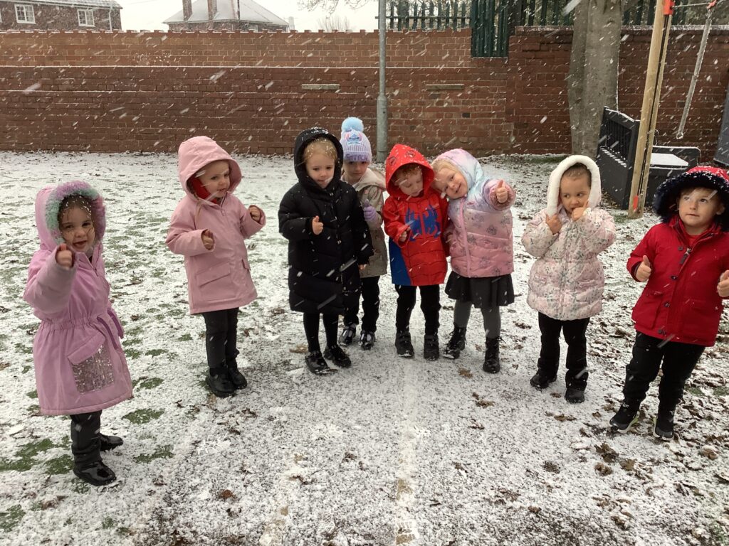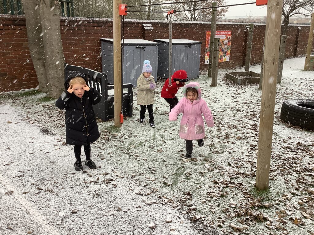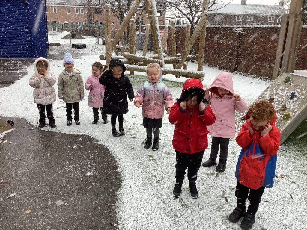 Today crew Frost have timed it perfectly in our phonic session by planning and executing another environmental walk. During this phonics session nursery focused on the weather by marking marks on their boards for what they could see and the way the weather felt. When we came back we practiced our Fredding skills by asking questions such as was it h-o-t? Then we used our think, pair, share protocol to discuss the meanings to the marks we had made for our outside adventure. The children loved the snow! Well done for another successful phonics session Crew Frost.