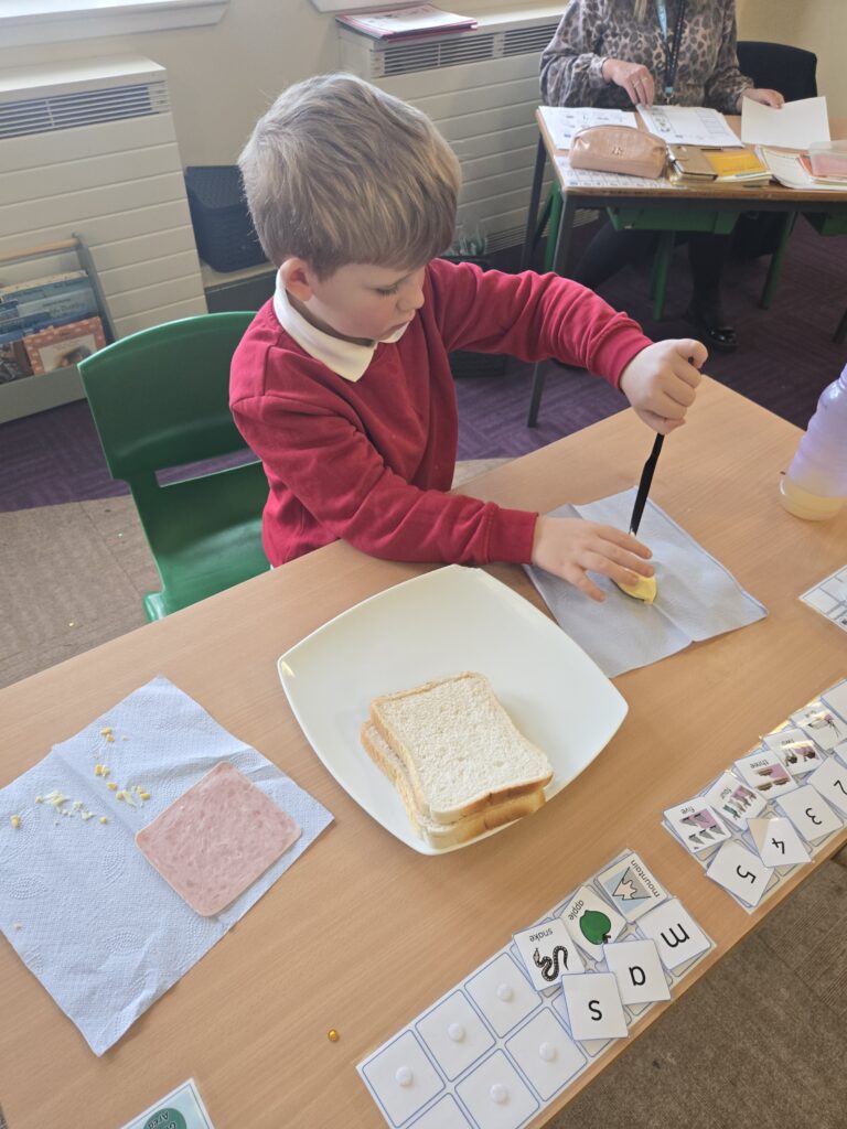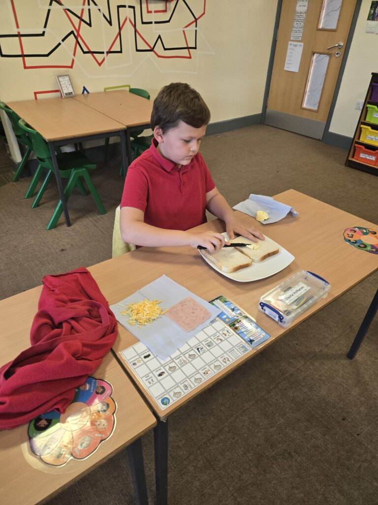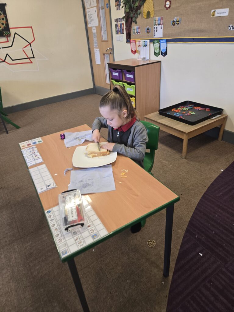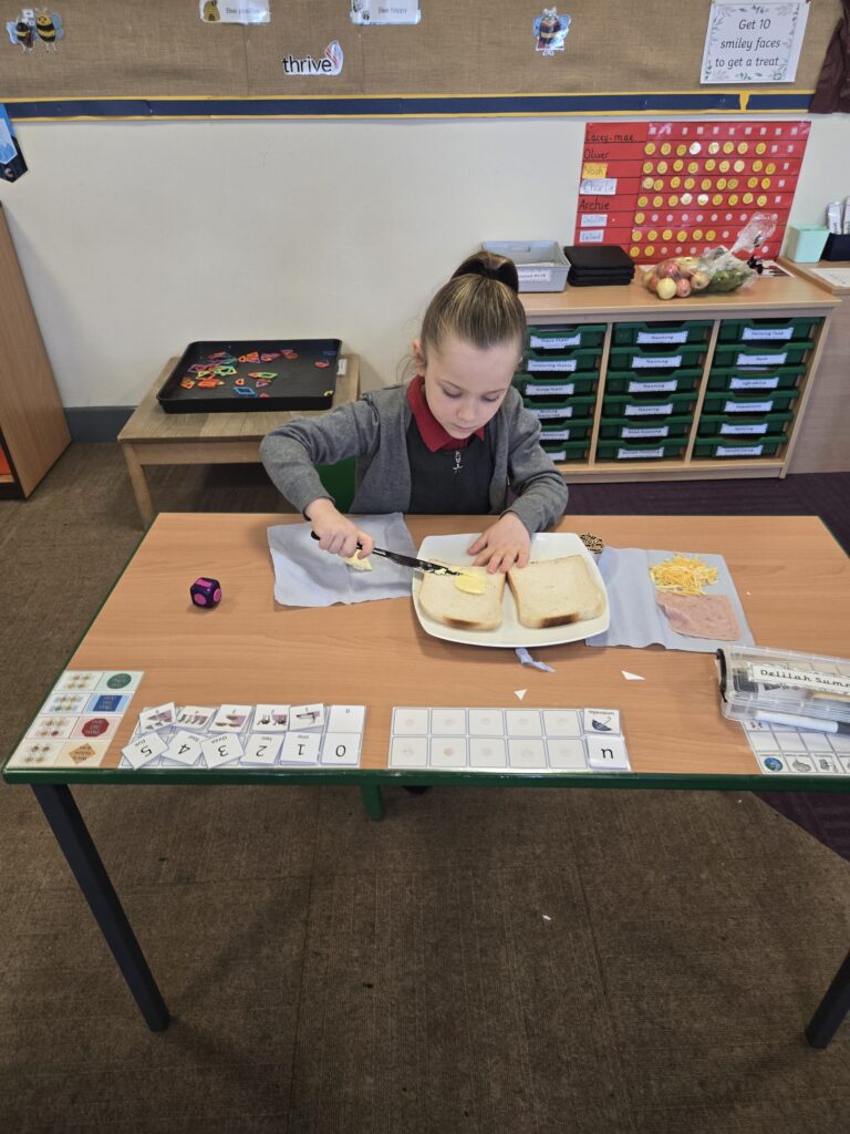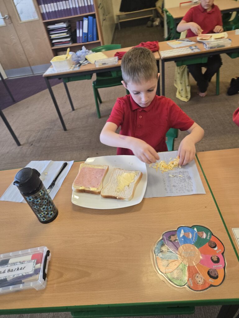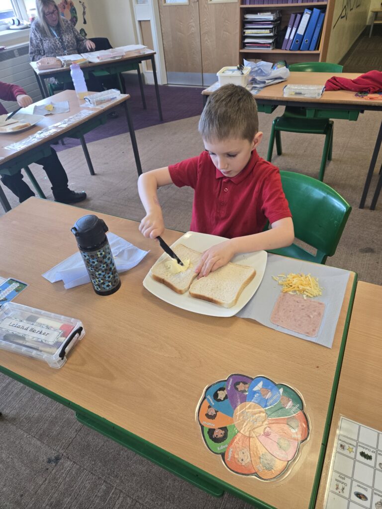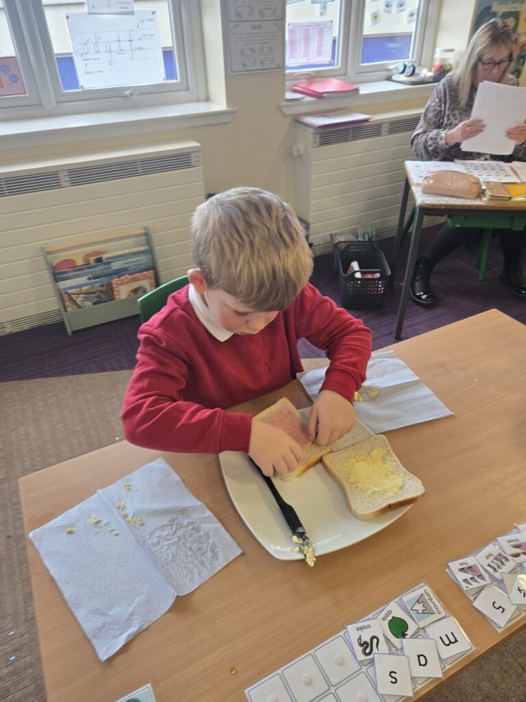 So today in Crew Haddock the children made their own ham and cheese sandwich. They did a super job at following the instructions. They were so careful when they used their knife to butter the bread and then cut it in half.