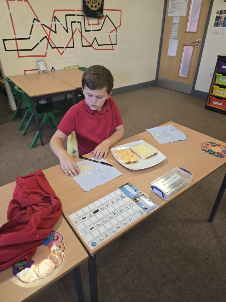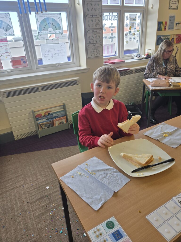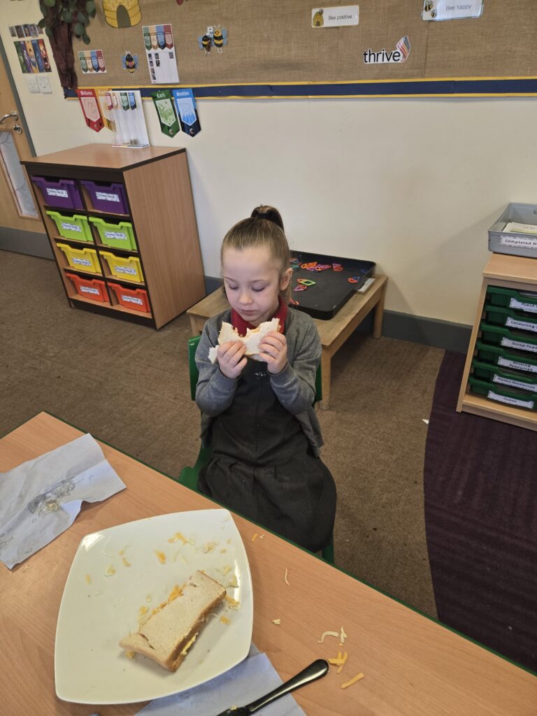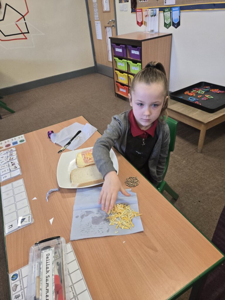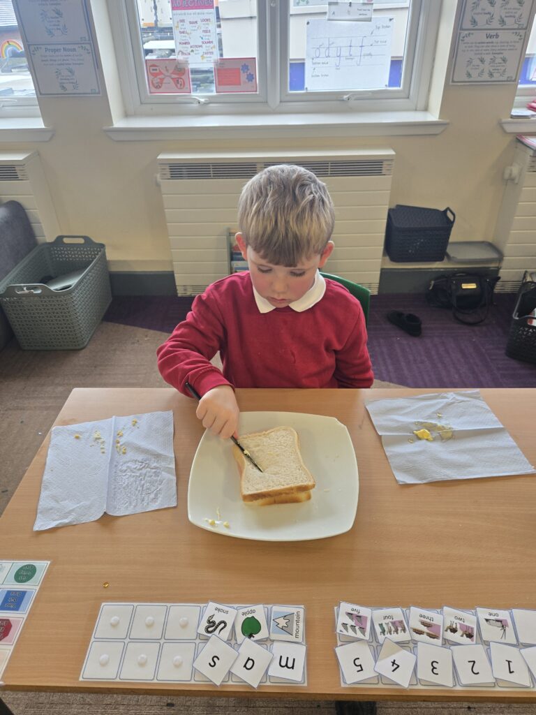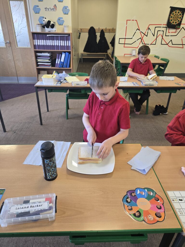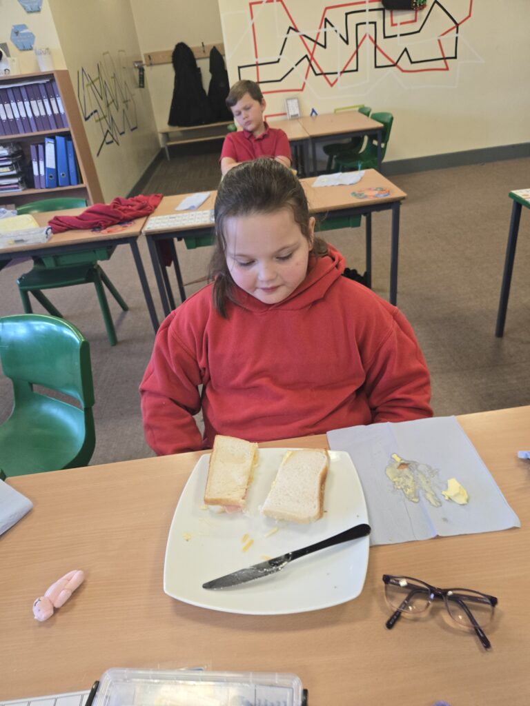 So today in Crew Haddock the children made their own ham and cheese sandwich. They did a super job at following the instructions. They were so careful when they used their knife to butter the bread and then cut it in half.