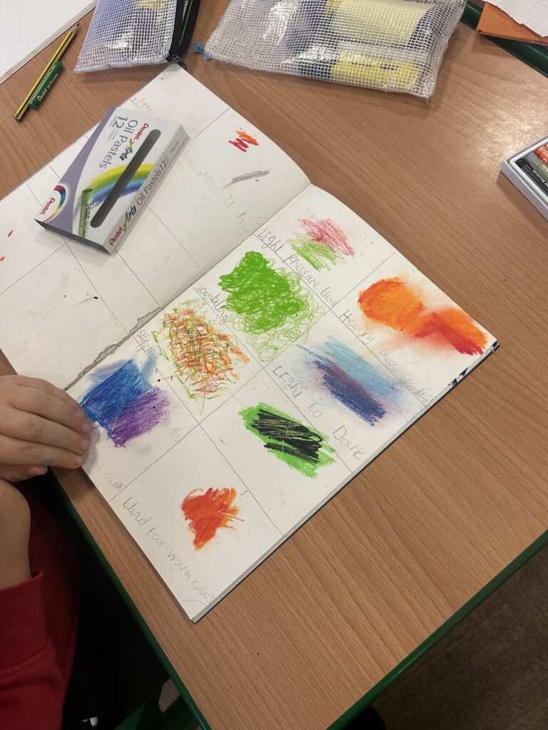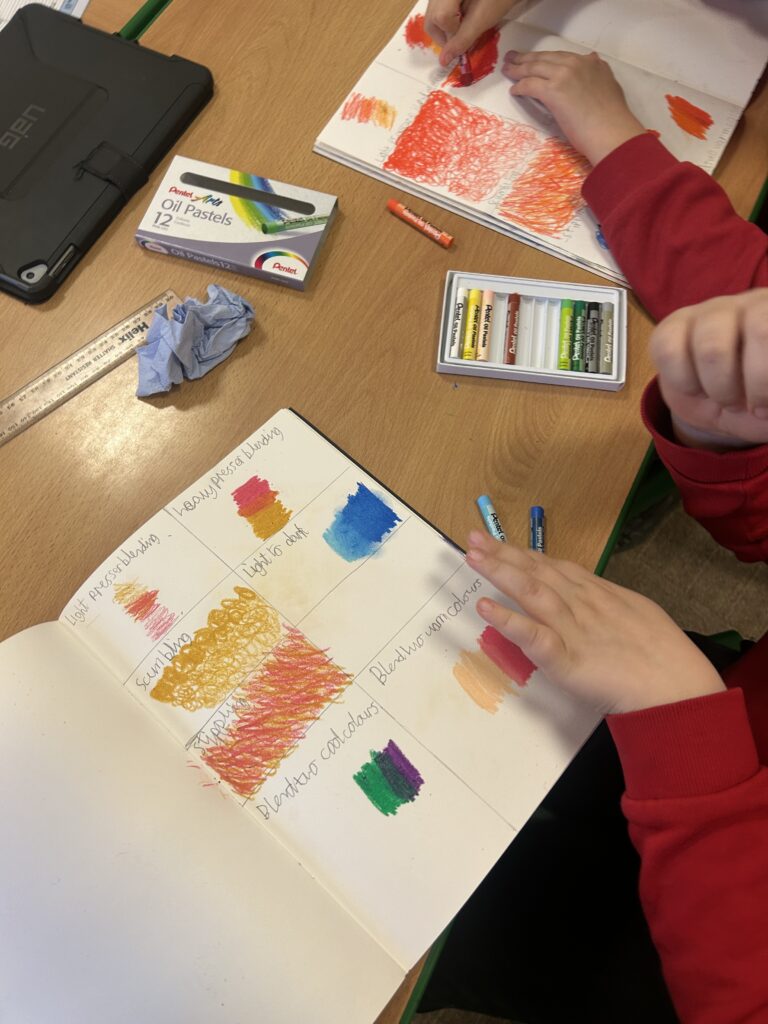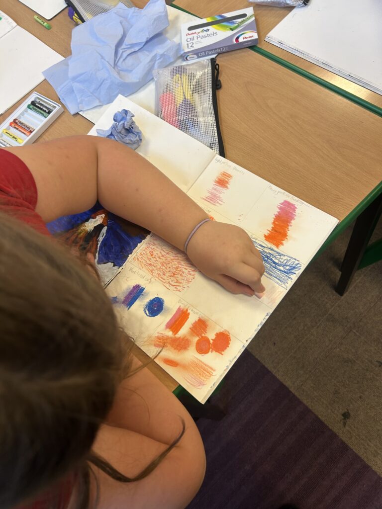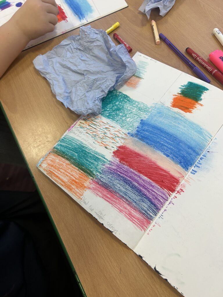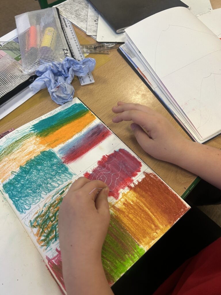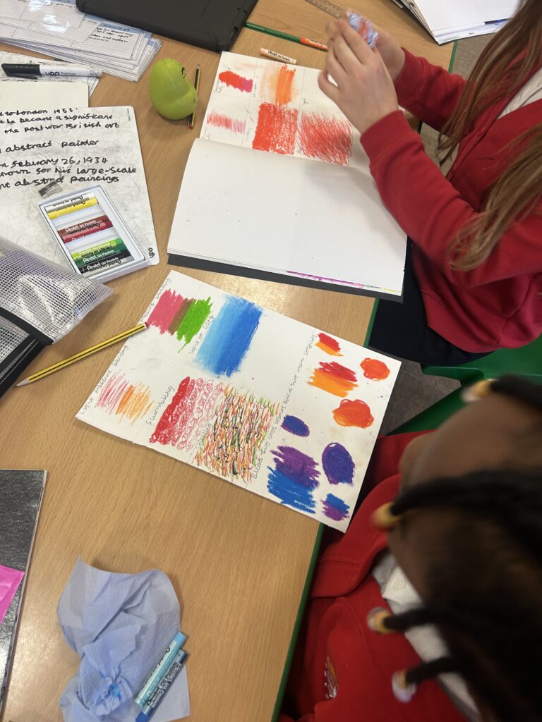 Today, they moved on to researching their artist, Frank Bowling, exploring his vibrant style to inspire their own work. They also spent time practising key oil pastel skills, including sgraffito and blending from light to dark, building a strong foundation for the artwork they’ll create later in the case study.