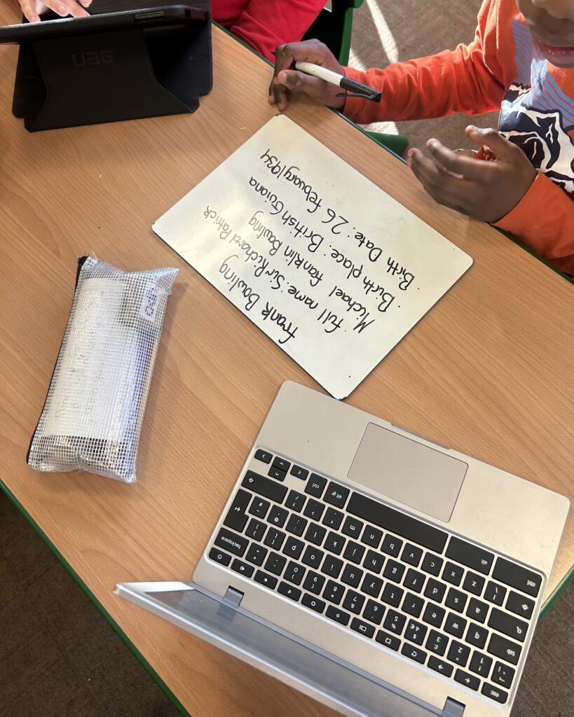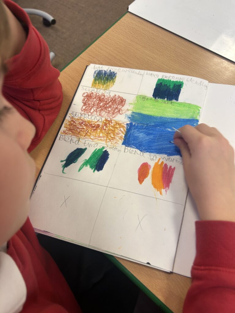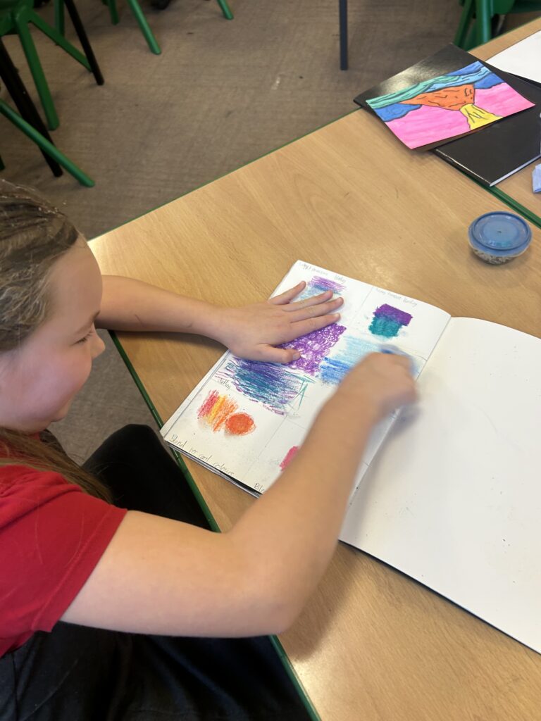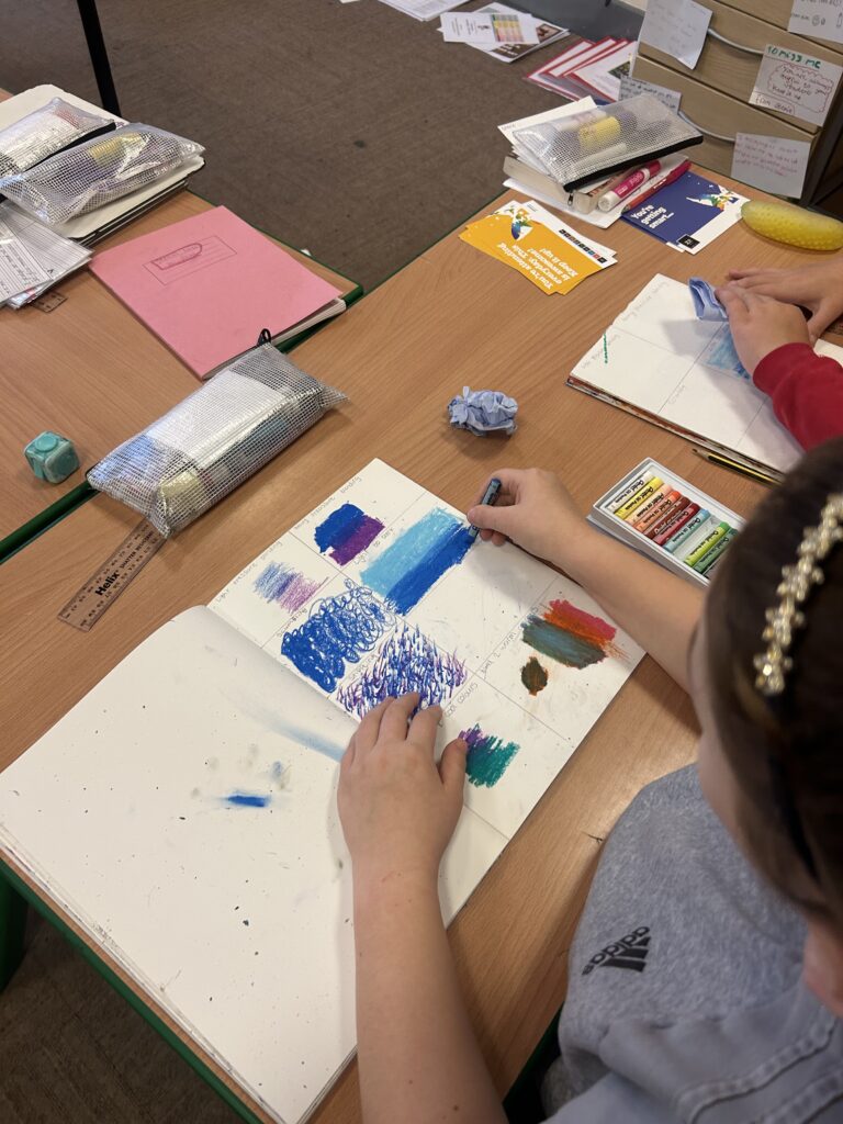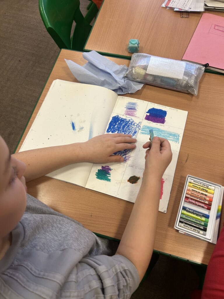 Today, they moved on to researching their artist, Frank Bowling, exploring his vibrant style to inspire their own work. They also spent time practising key oil pastel skills, including sgraffito and blending from light to dark, building a strong foundation for the artwork they’ll create later in the case study.