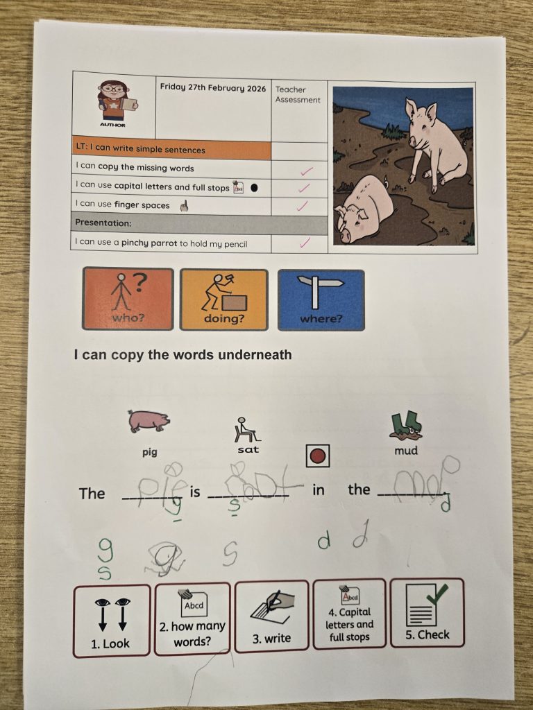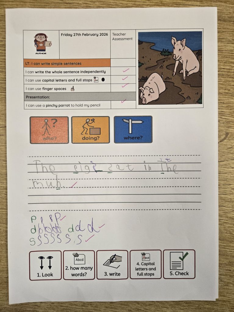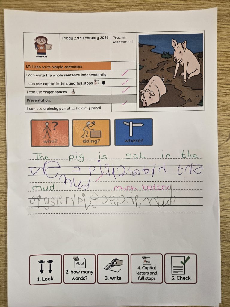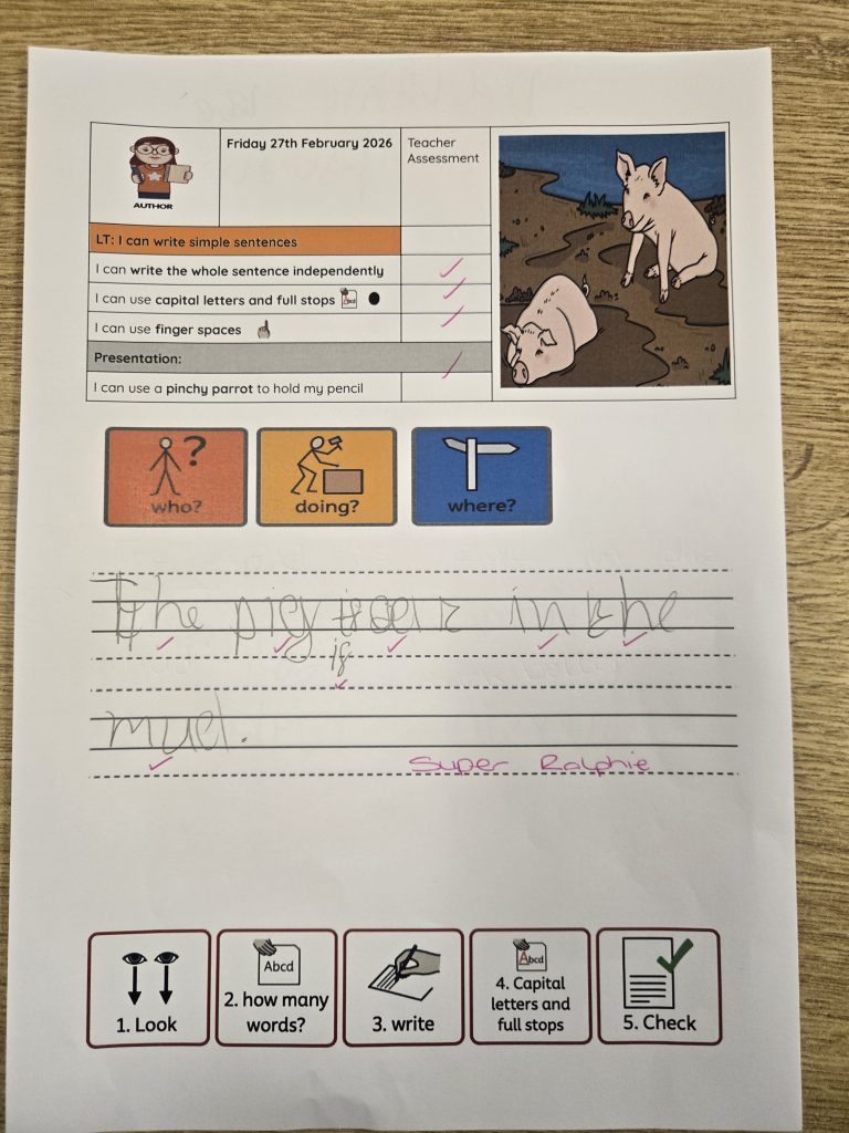 Today in writing they copied the sentence making sure they used a capital letter at the beginning of the sentence followed by a full stop at the end of the sentence. We made sure that we had finger spaces in between our words. In activate (do now ) we checked that we knew what who?, doing? and where? .We made sure by completing a task first before our writing.