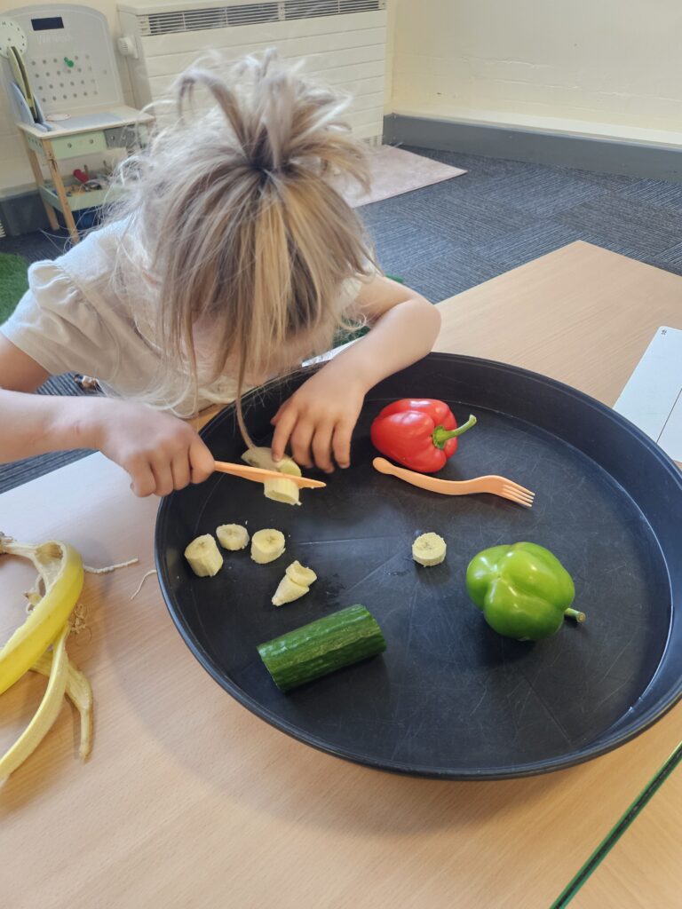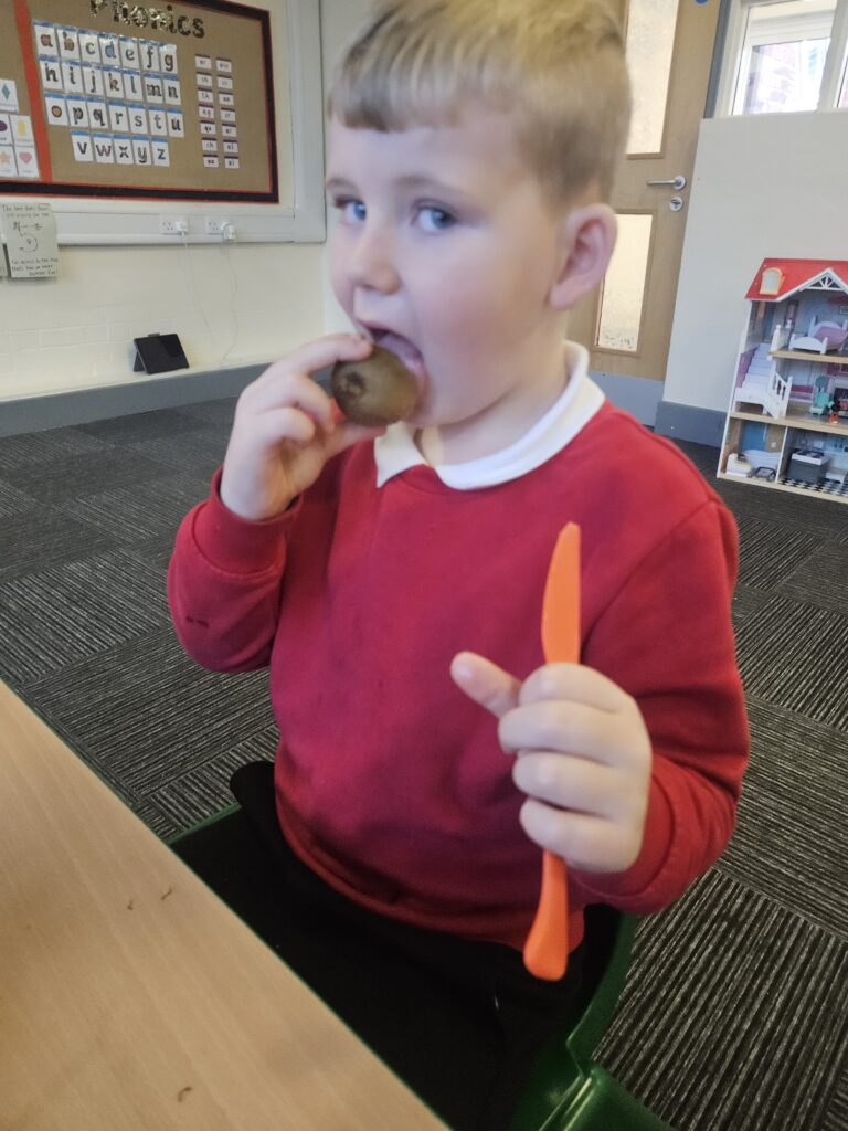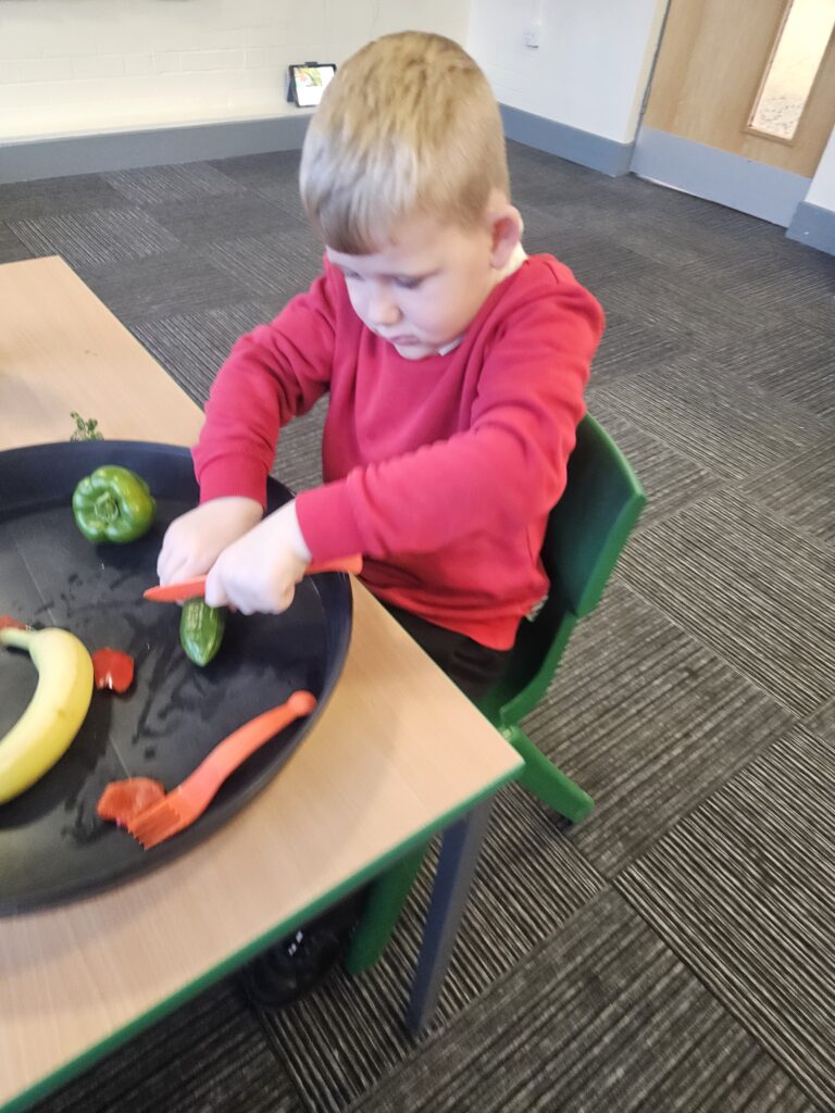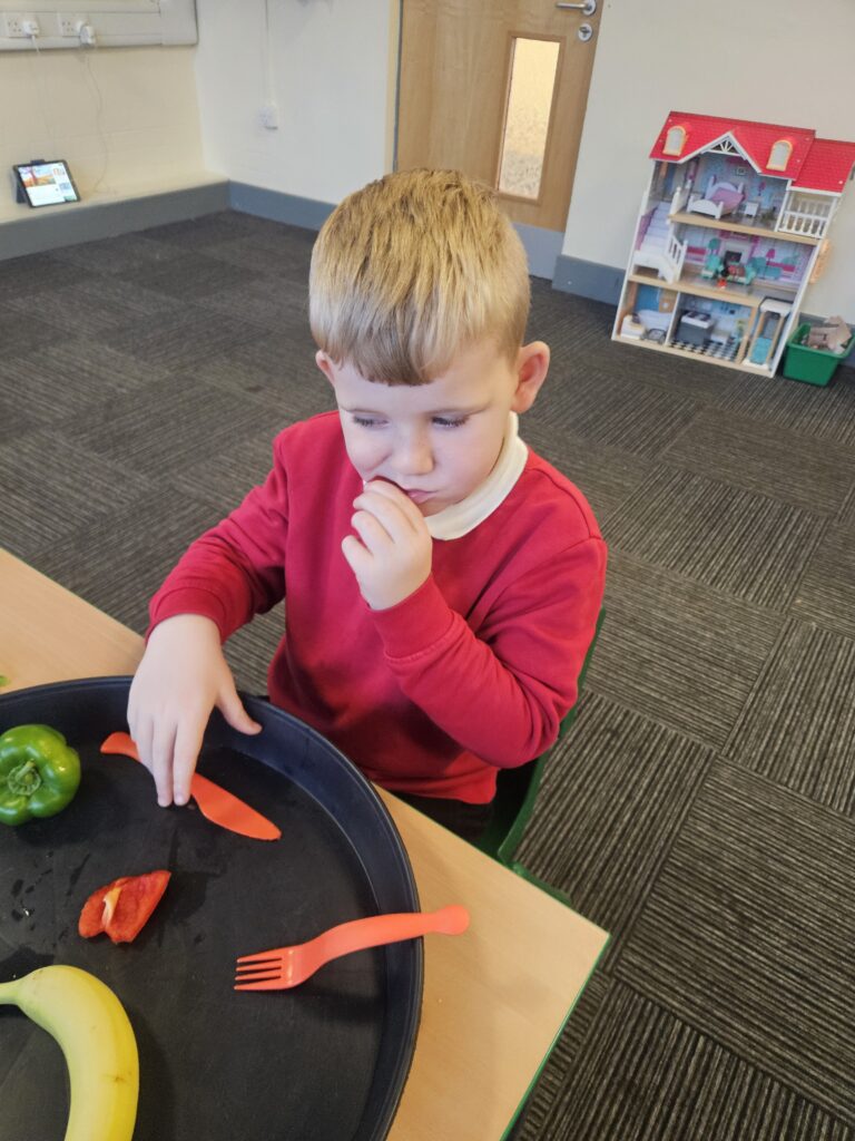 This week we tried something new in class, the life skill, cutting food with a knife and fork. The children did so well and knew to use different pressure for hard and soft food. They even tried some new foods, like Kiwi, which tasted ‘sour’ and noticed the different taste with red and green pepper, the red one was ‘sweeter’.