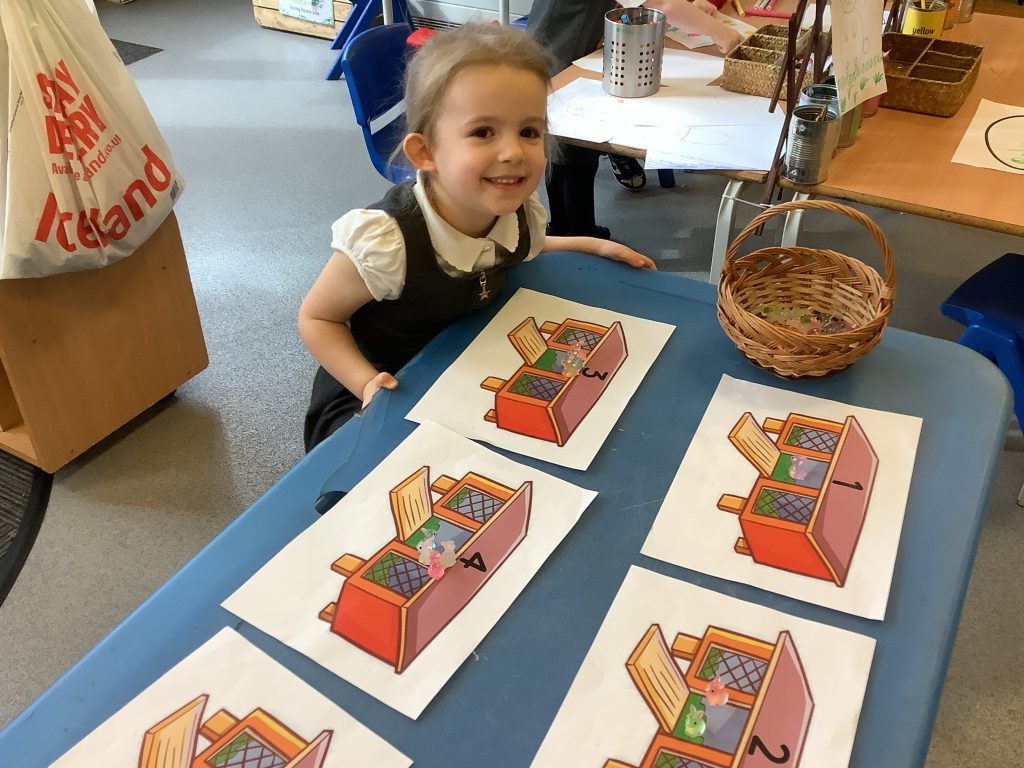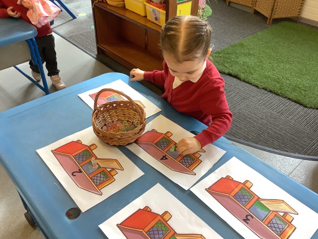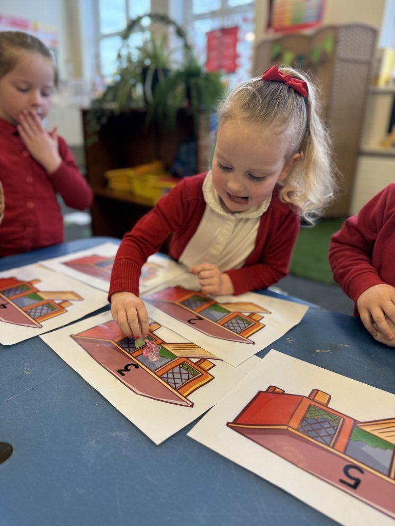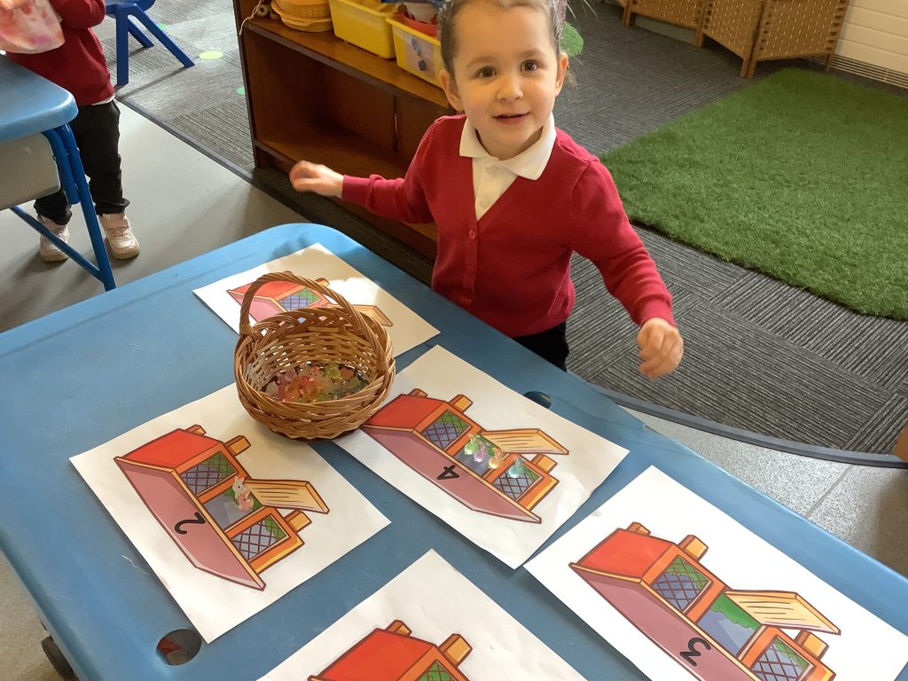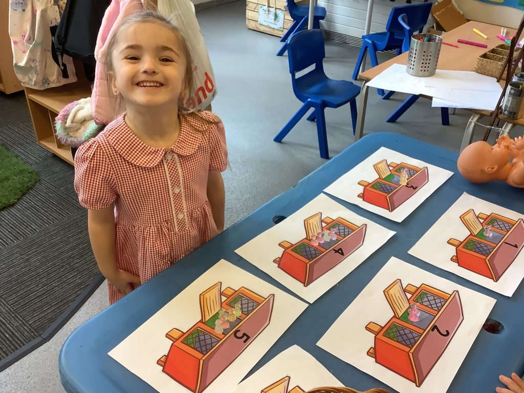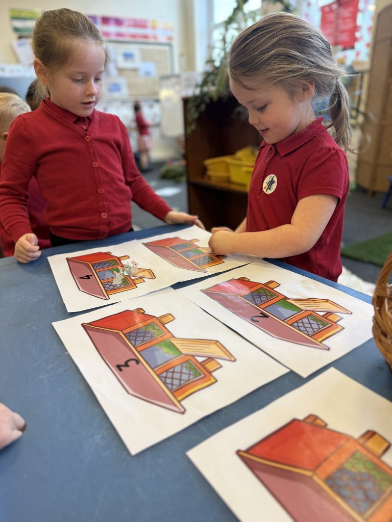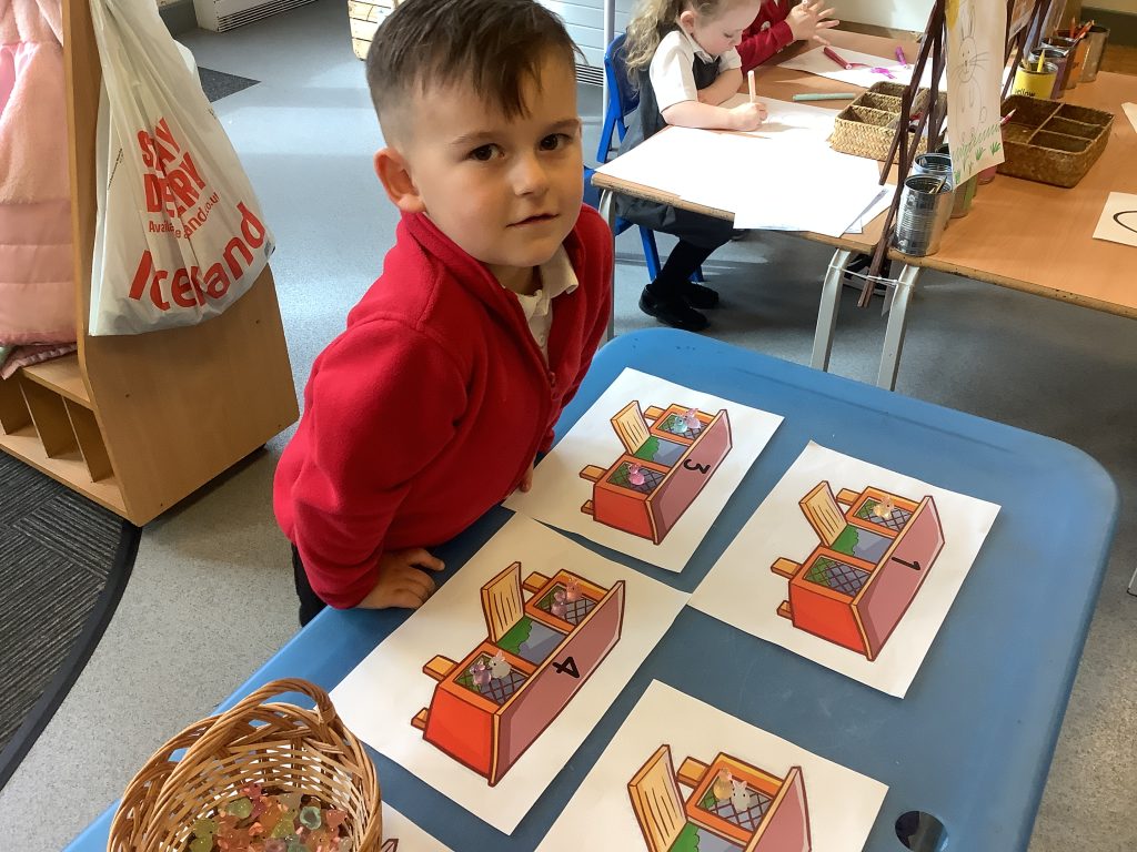 The children were encouraged to count out the correct number of rabbits for each hutch. This supported their understanding of matching quantity to number, which is a key aspect of the EYFS Maths area of learning.