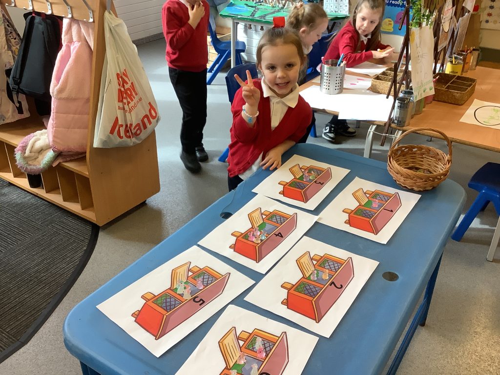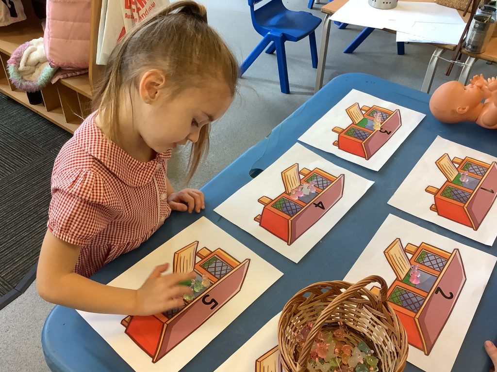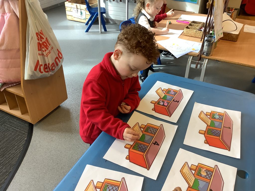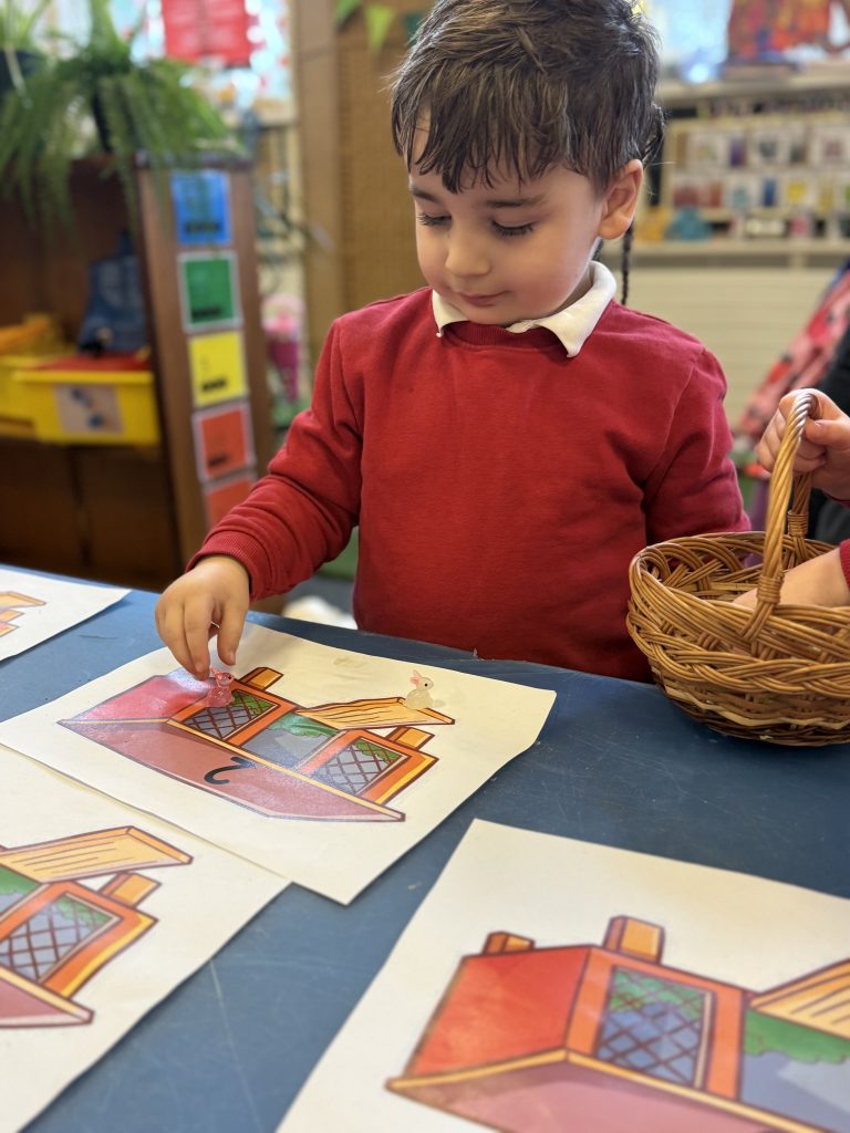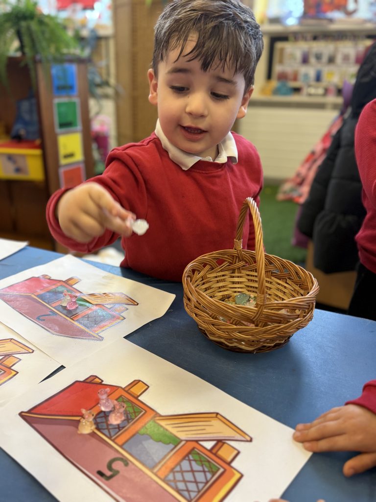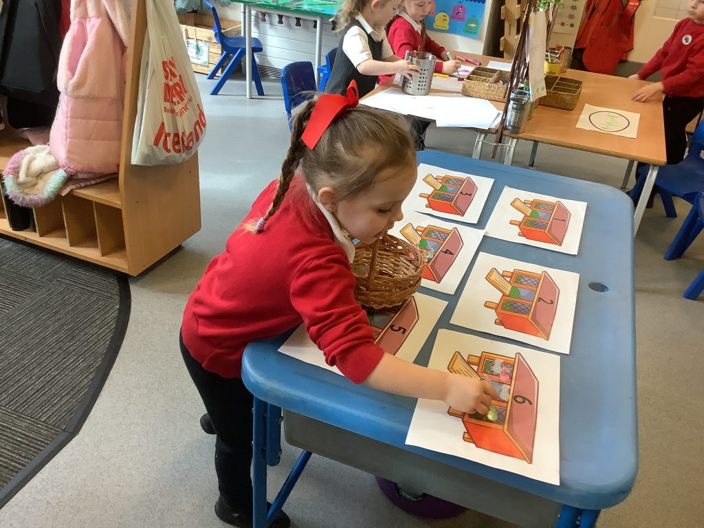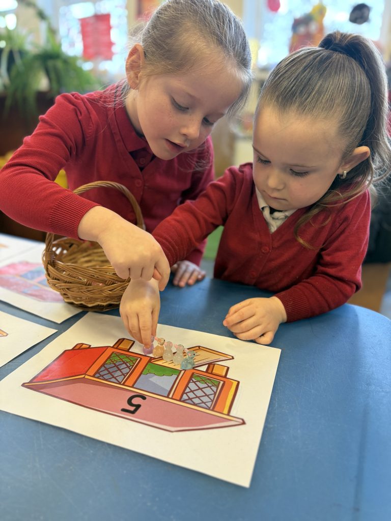 The children were encouraged to count out the correct number of rabbits for each hutch. This supported their understanding of matching quantity to number, which is a key aspect of the EYFS Maths area of learning.