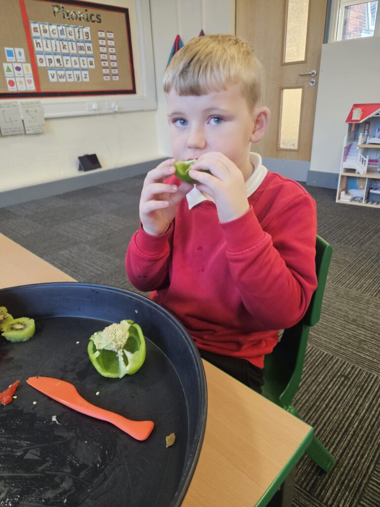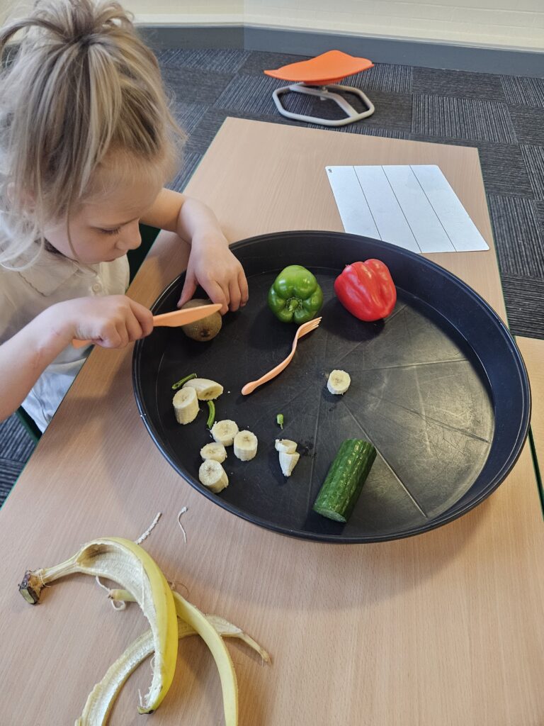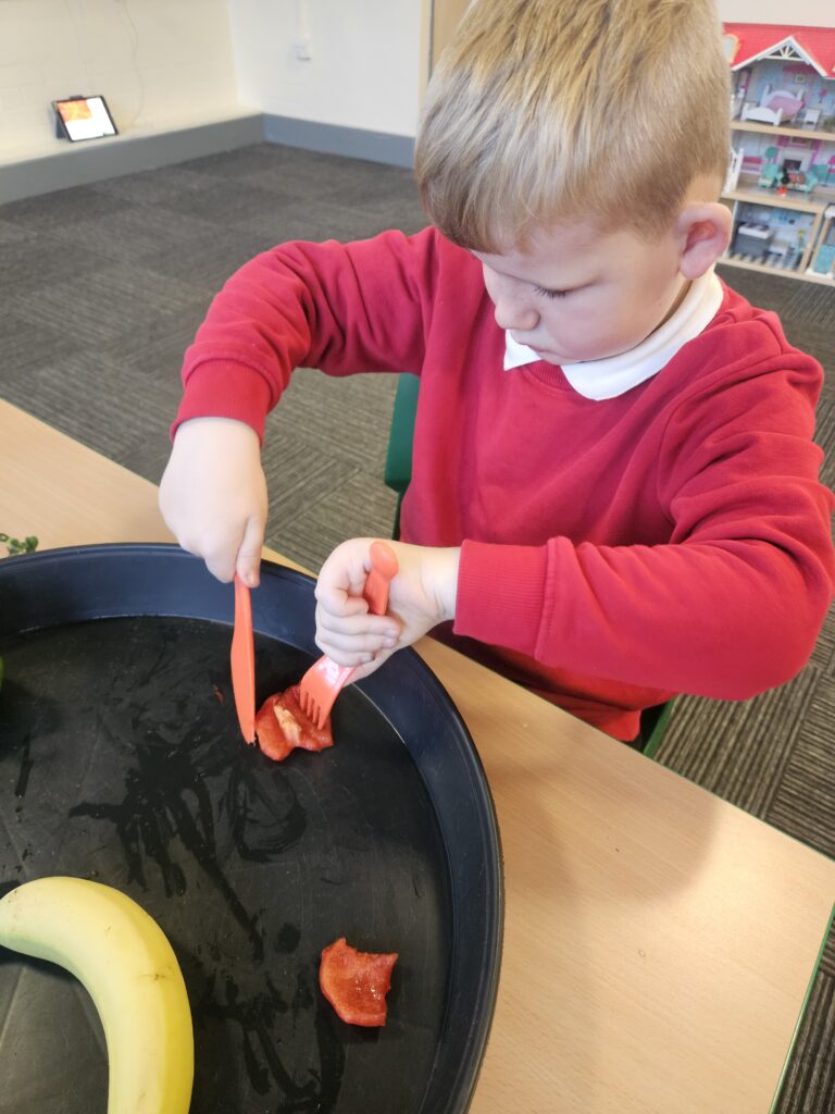 This week we tried something new in class, the life skill, cutting food with a knife and fork. The children did so well and knew to use different pressure for hard and soft food. They even tried some new foods, like Kiwi, which tasted ‘sour’ and noticed the different taste with red and green pepper, the red one was ‘sweeter’.