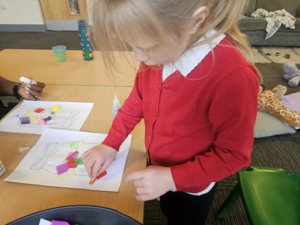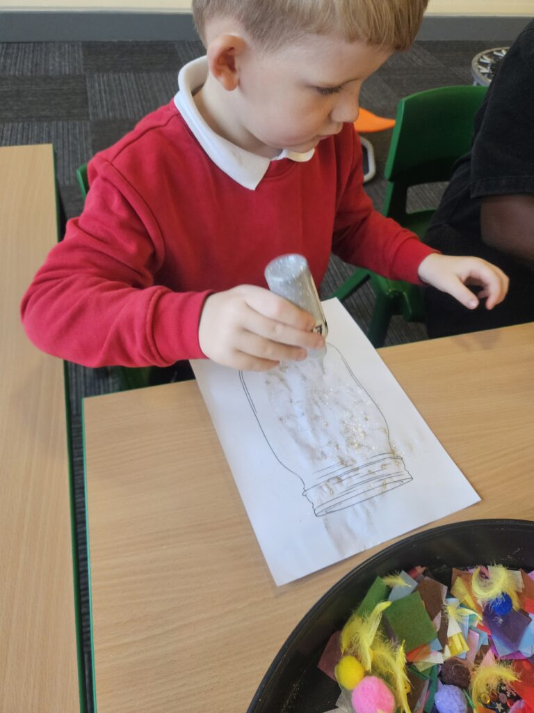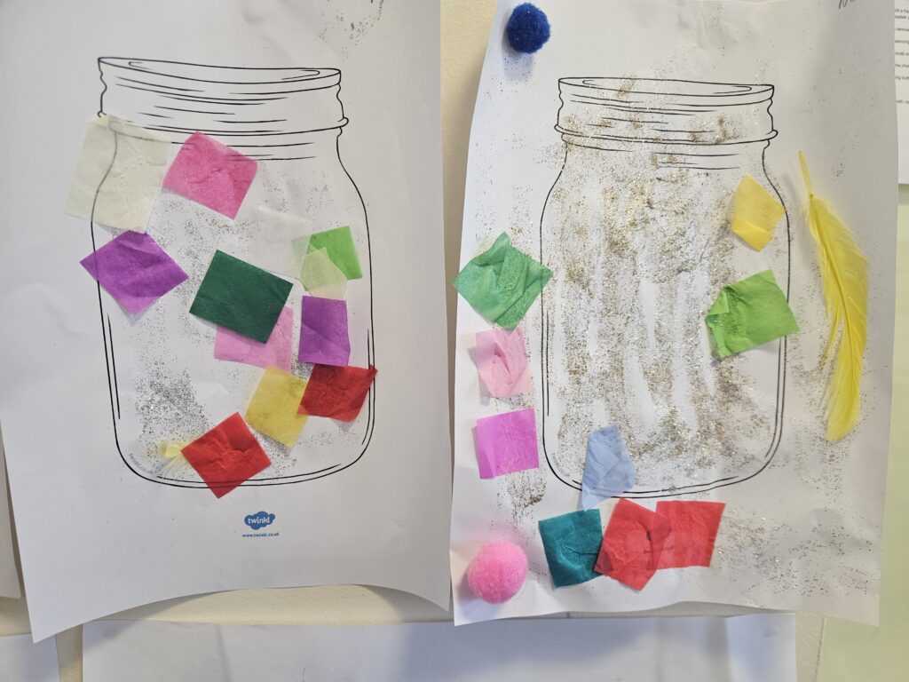 Today we made our very own Dream Jar from the book The BFG. We loved getting creative using different mediums like glitter and sequins. We talked about what glitter could represent in a dream, glitter can mean happy and exciting , dark colours can mean sad or angry dreams, we call them nightmares.