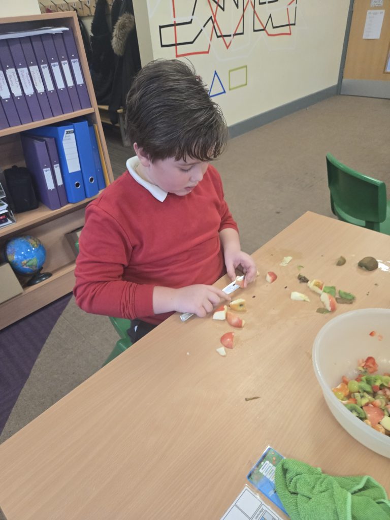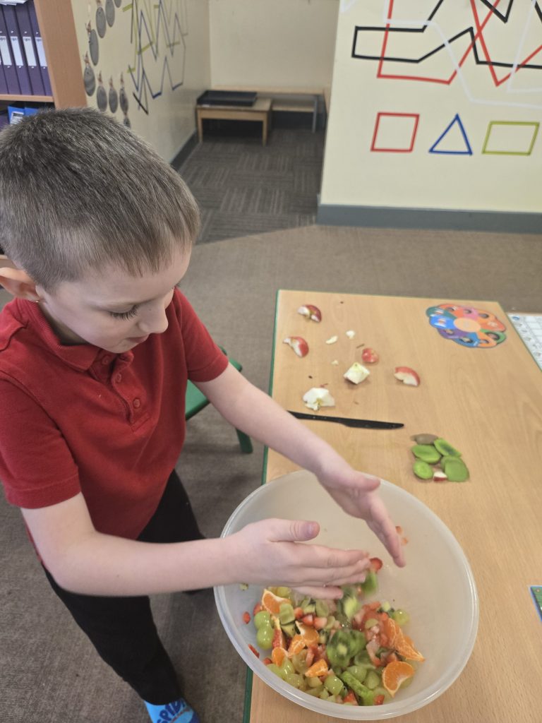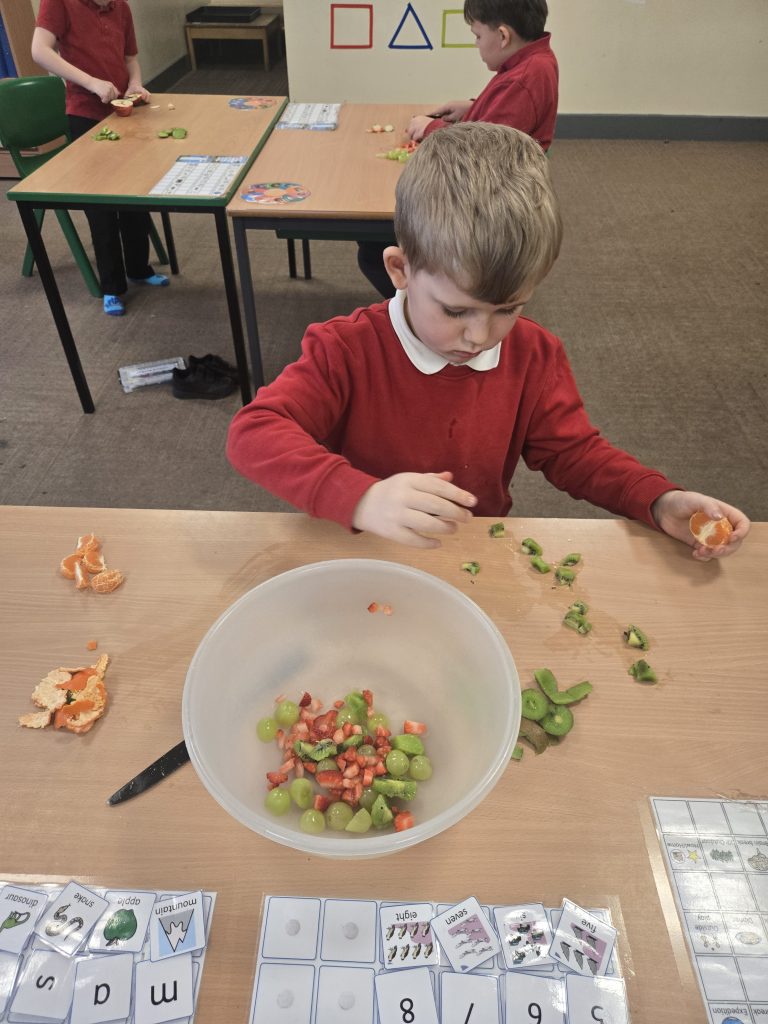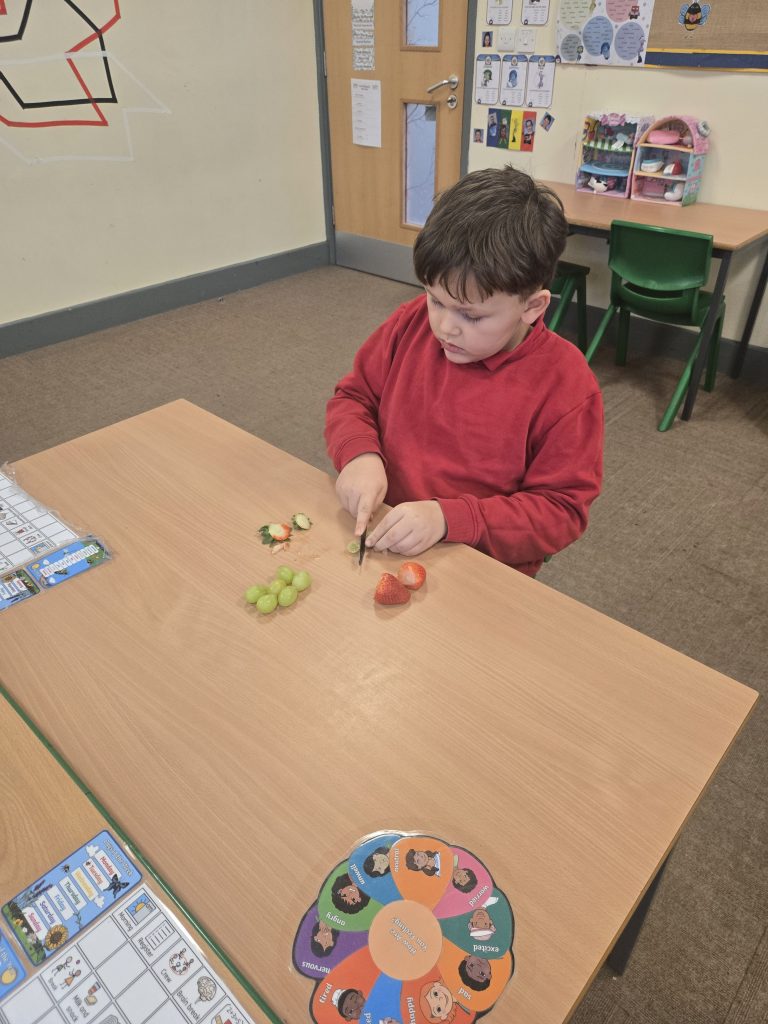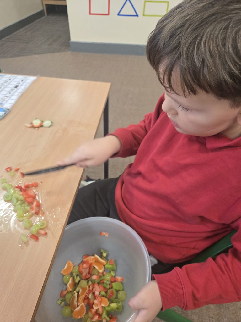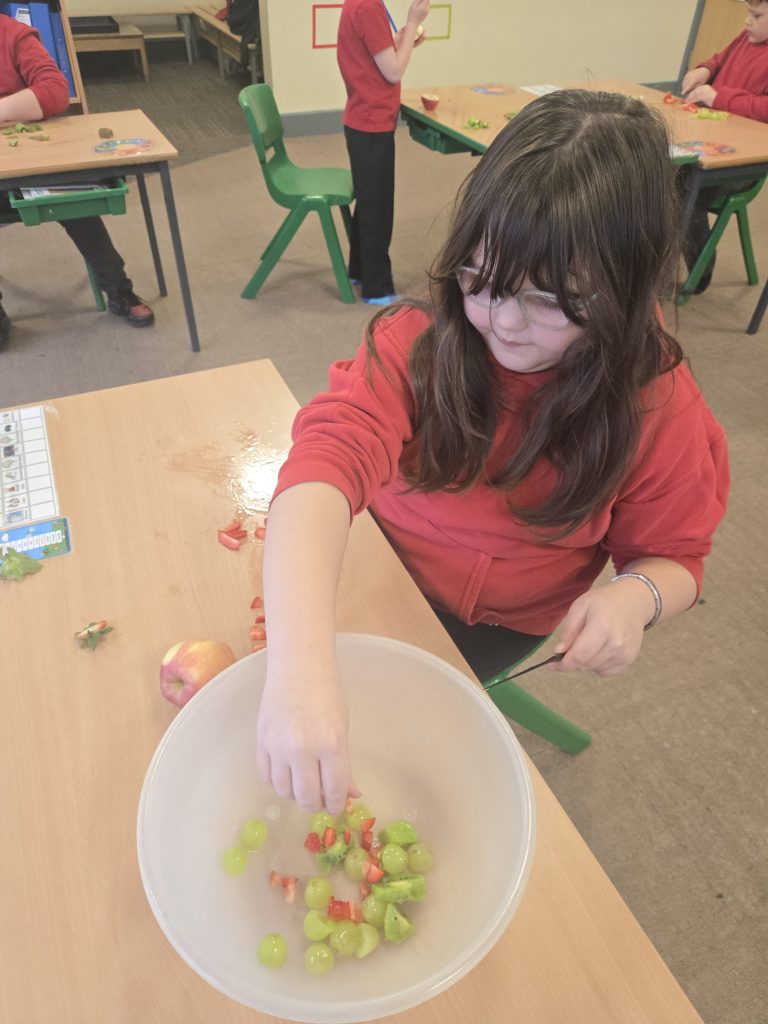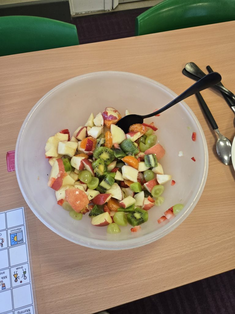 Today in life skill they made their own fruit salad. Fruit is one of are 5 a day that are body needs. They used their cutting skills to slice the fruit and then put it all into a bowl.