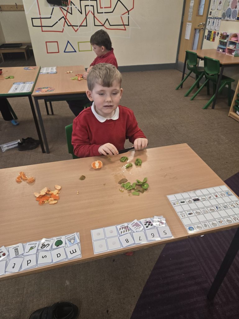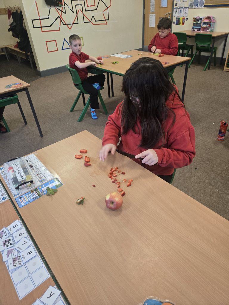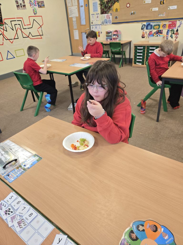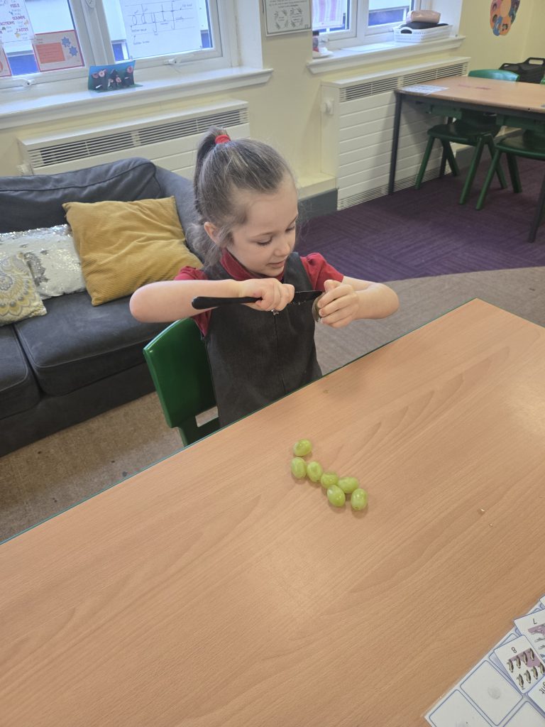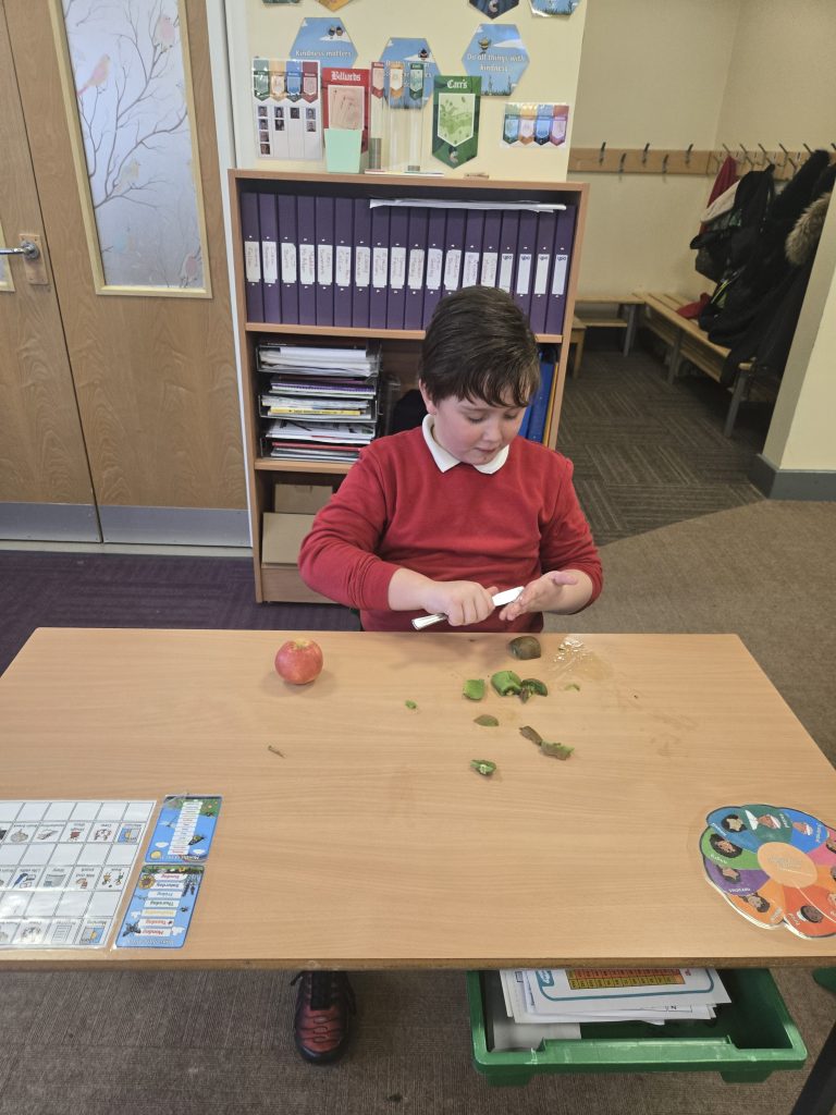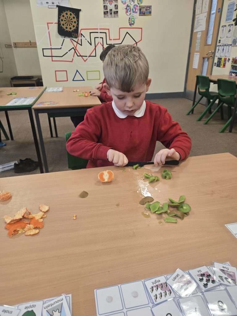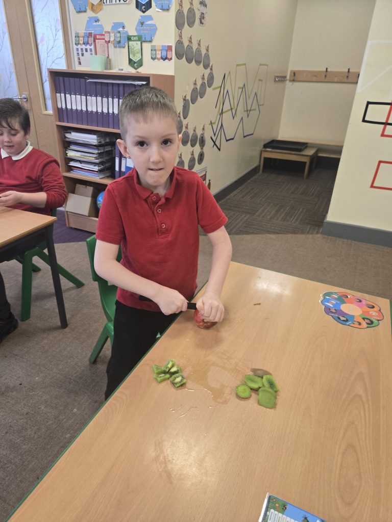 Today in life skill they made their own fruit salad. Fruit is one of are 5 a day that are body needs. They used their cutting skills to slice the fruit and then put it all into a bowl.