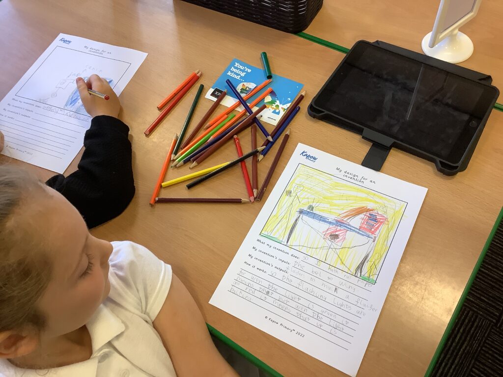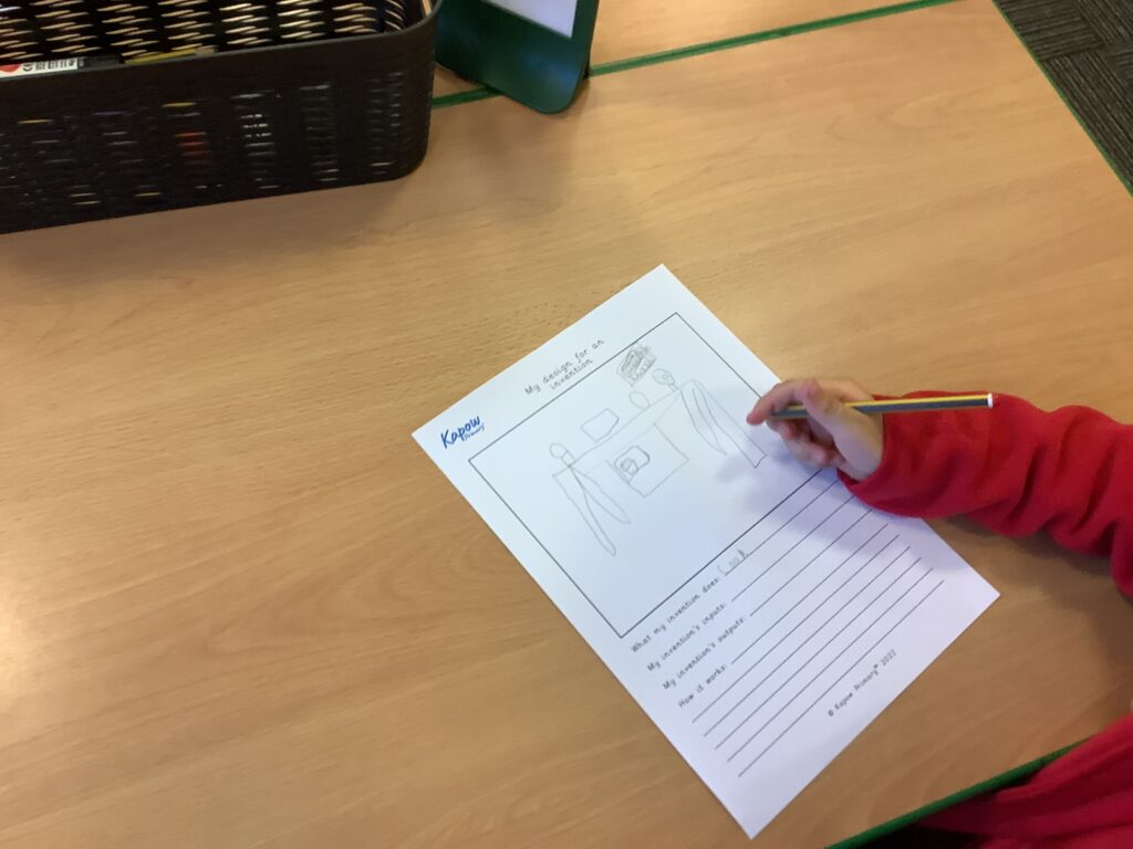 After a quick recap of last weeks lesson, Crew Ramsay have been designing their own inventions. Miss Shields modelled her own invention before children were able to work independently on their own. We had cupcake machines, a machine that built castles, a machine that dropped balloons from the ceiling or made birthday cakes on demand.