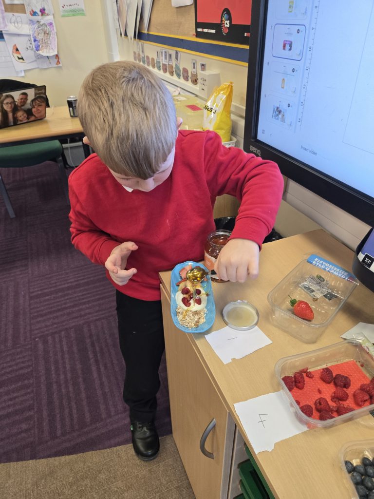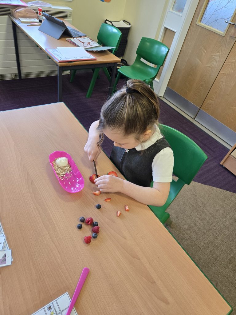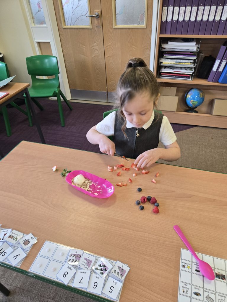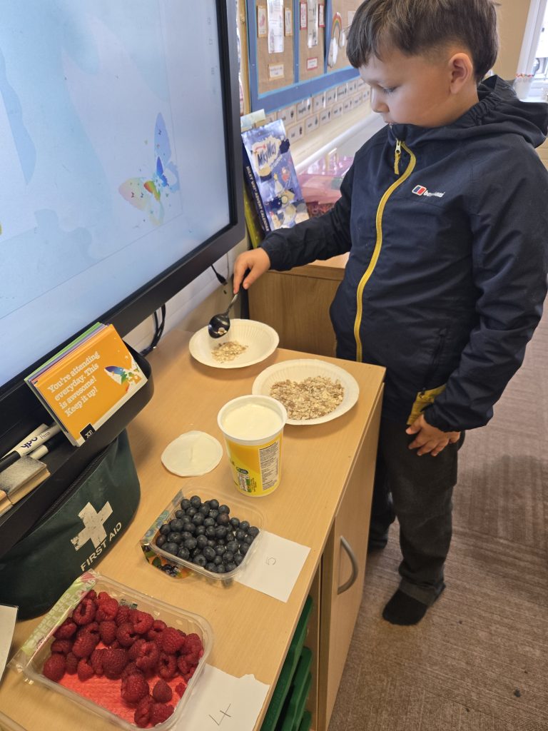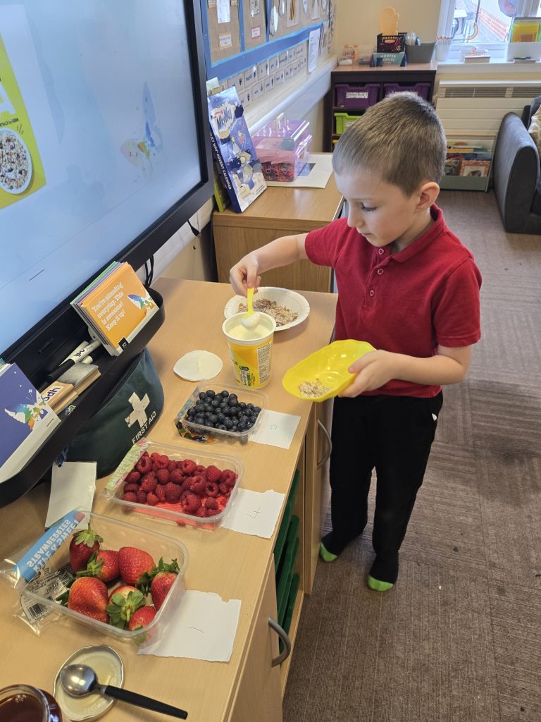 Today the made their own yoghurt muesli pots. The children really enjoyed the different fruit , muesli, yoghurt and honey. They practised their cutting skills when cutting the fruit with the knife. They all followed the instructions amazing.