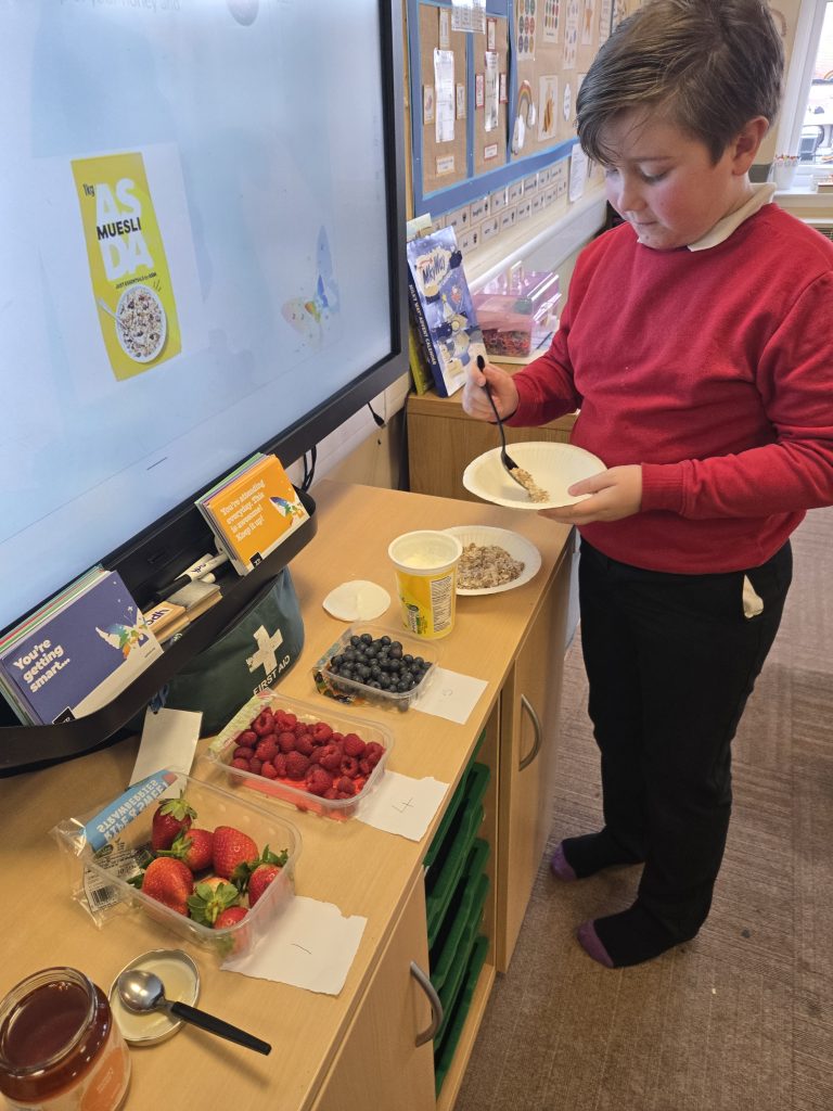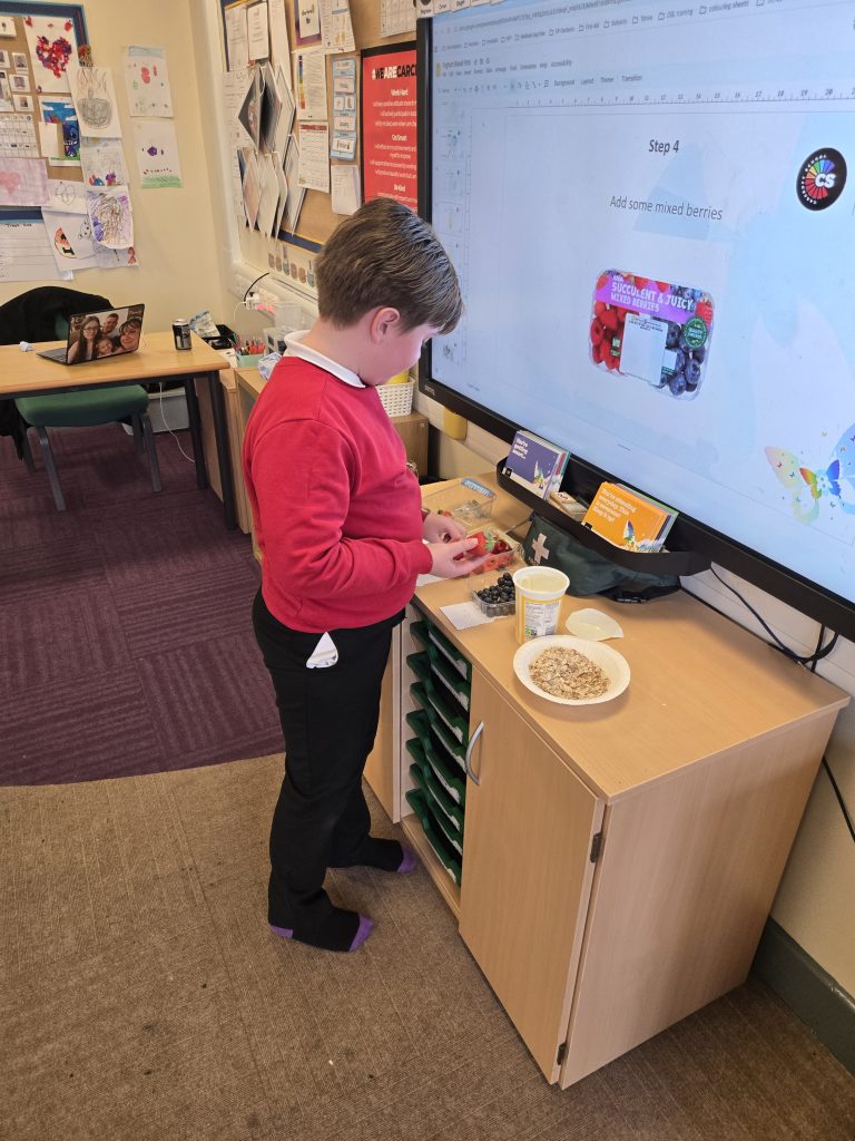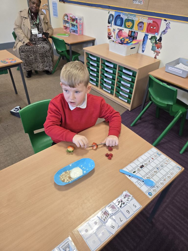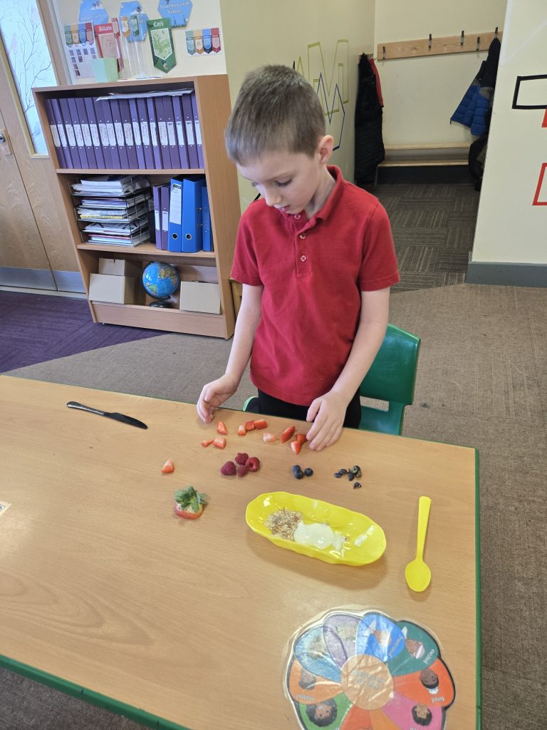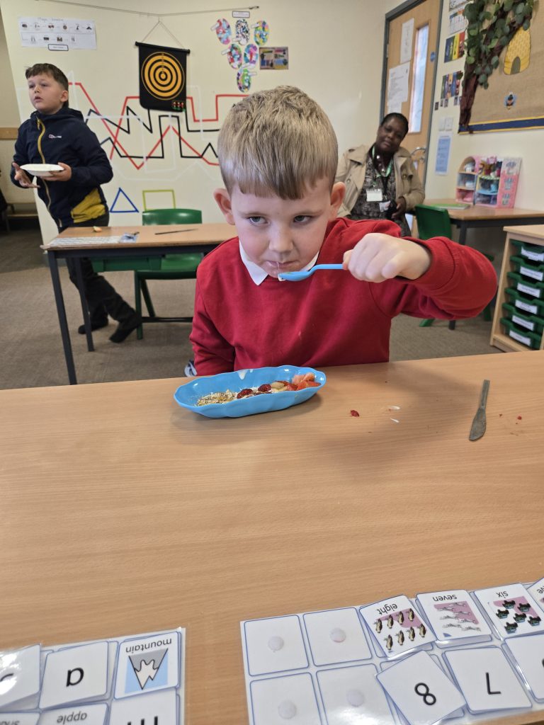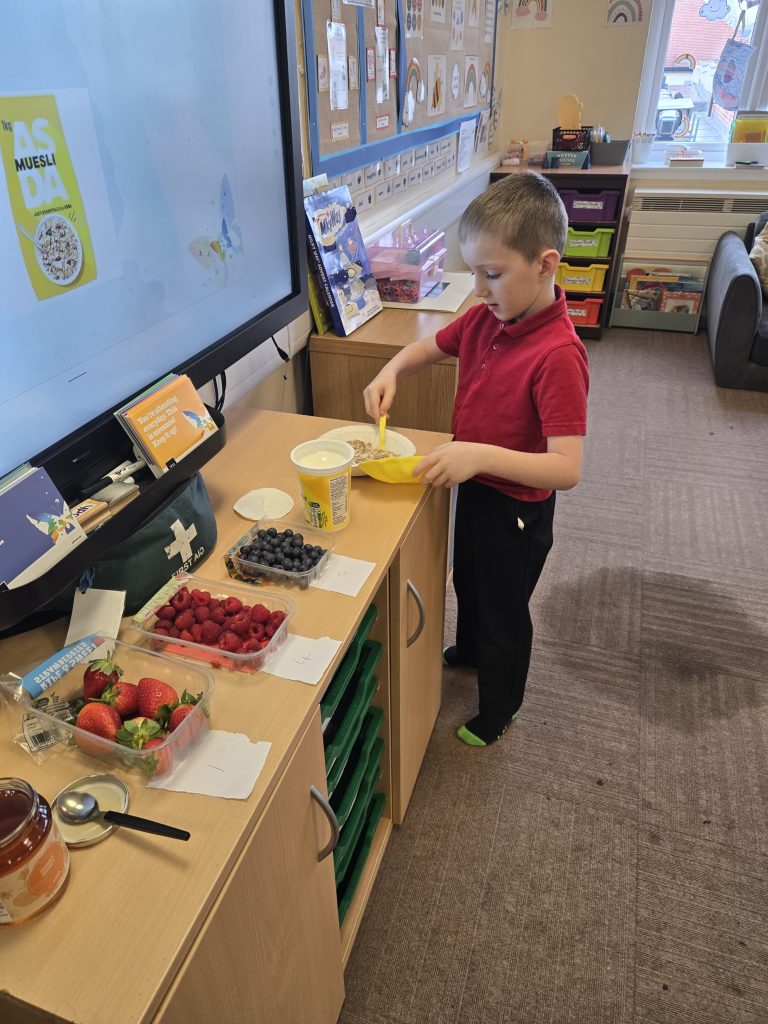 Today the made their own yoghurt muesli pots. The children really enjoyed the different fruit , muesli, yoghurt and honey. They practised their cutting skills when cutting the fruit with the knife. They all followed the instructions amazing.