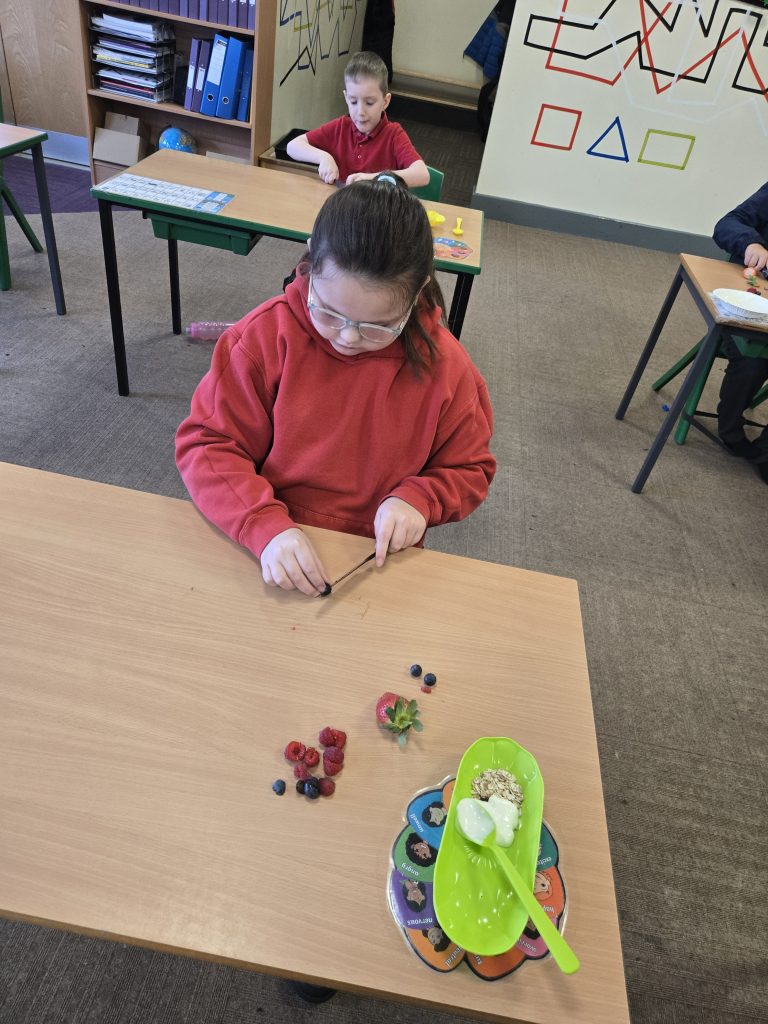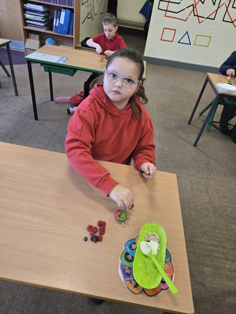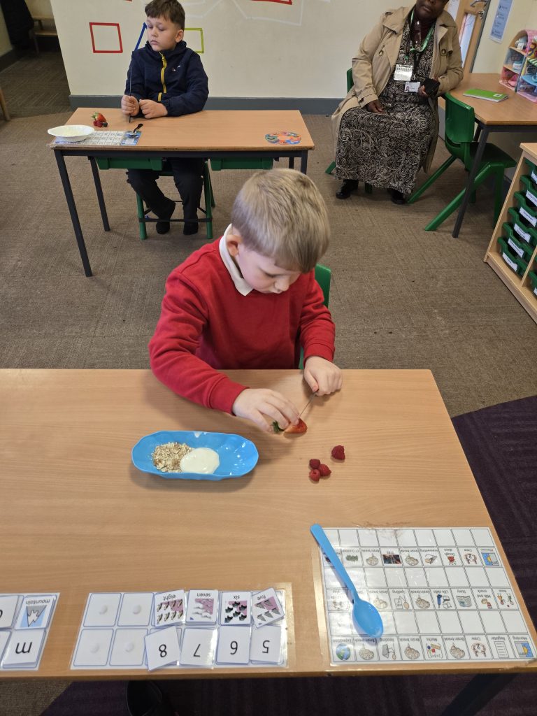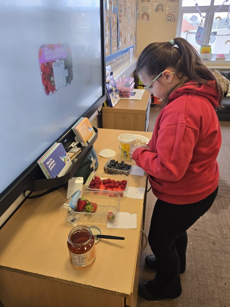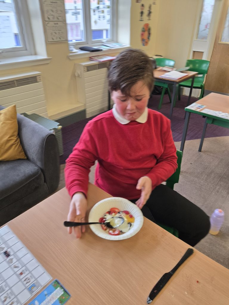 Today the made their own yoghurt muesli pots. The children really enjoyed the different fruit , muesli, yoghurt and honey. They practised their cutting skills when cutting the fruit with the knife. They all followed the instructions amazing.