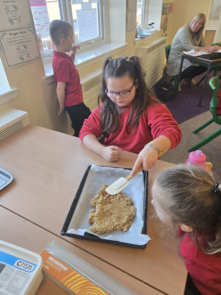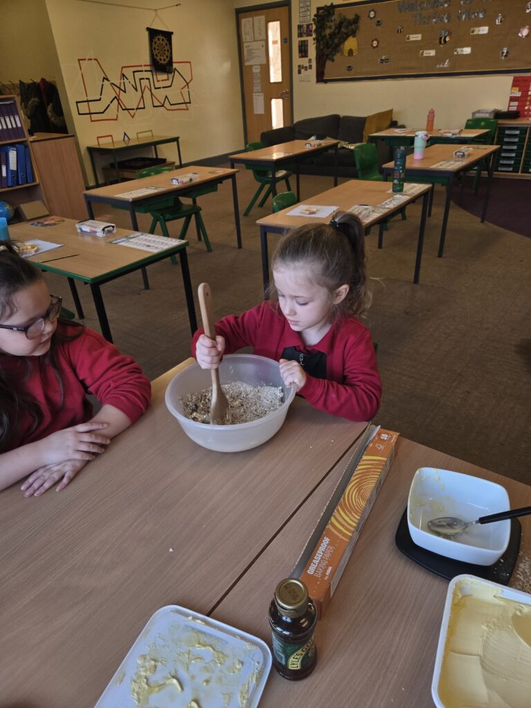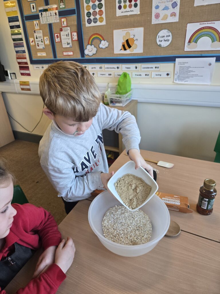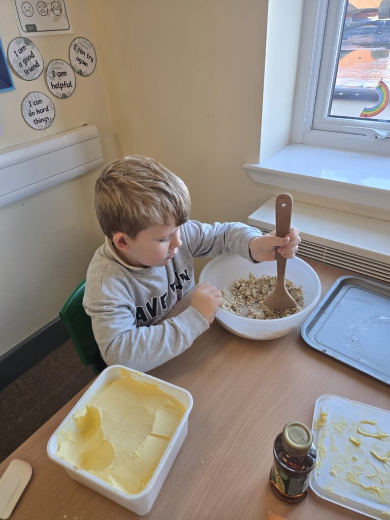 In Crew Haddock today the children made flapjack. They were so kind in taking turns and then they shared it with staff around school. This is their favourite thing to do.